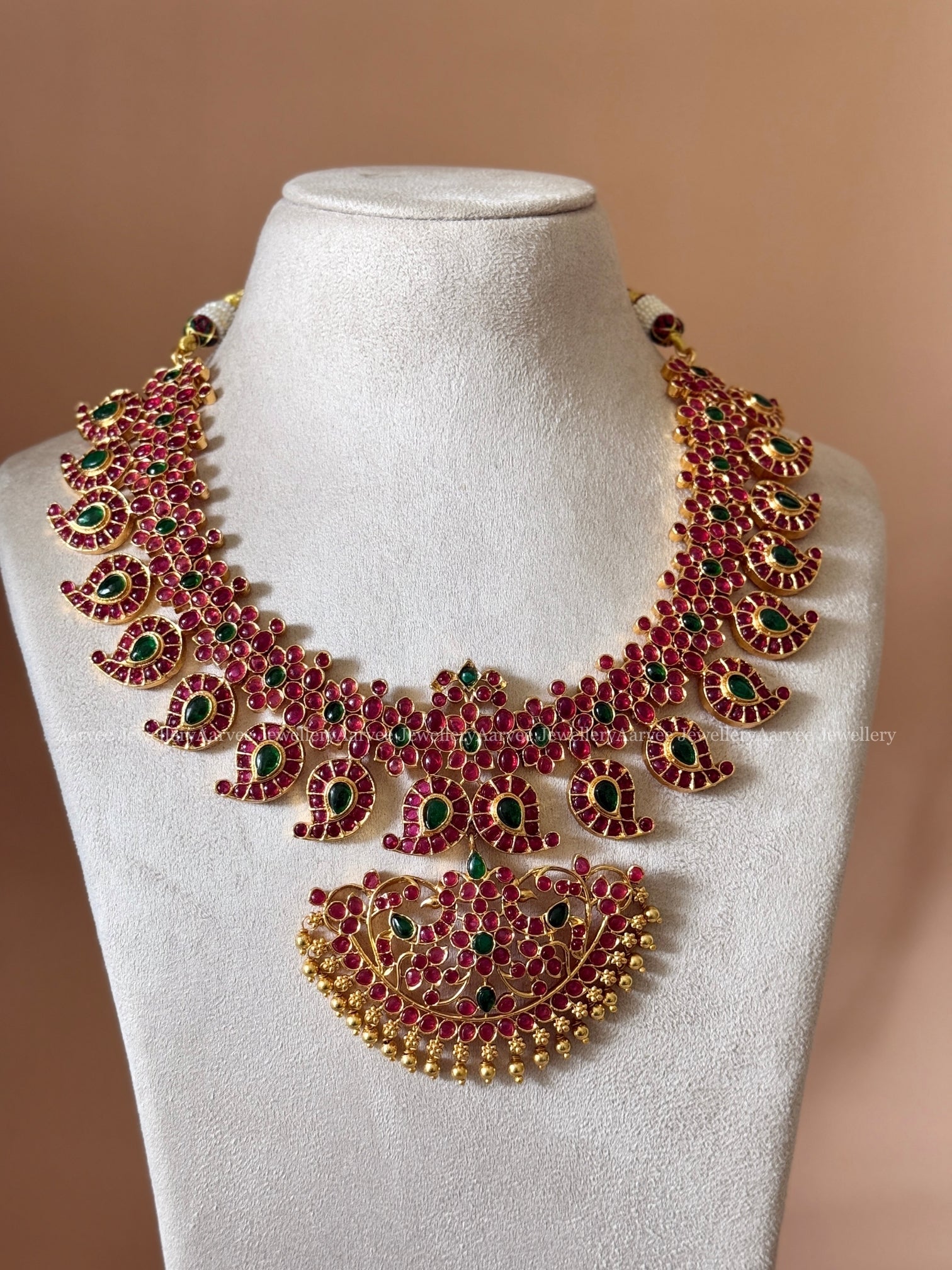 Traditional Mango Motif Necklace Set with Kemp Ruby and Green Stone Accents