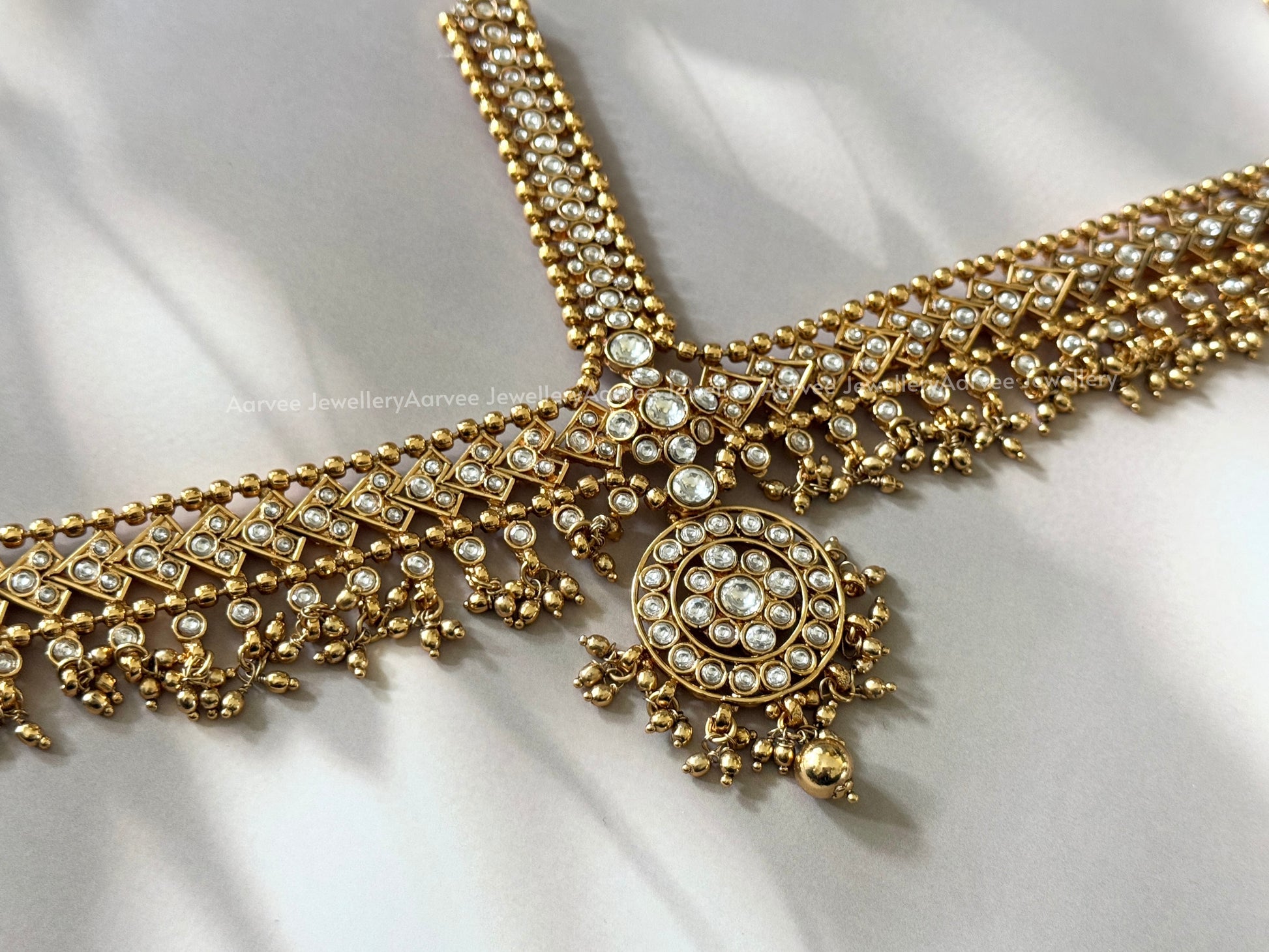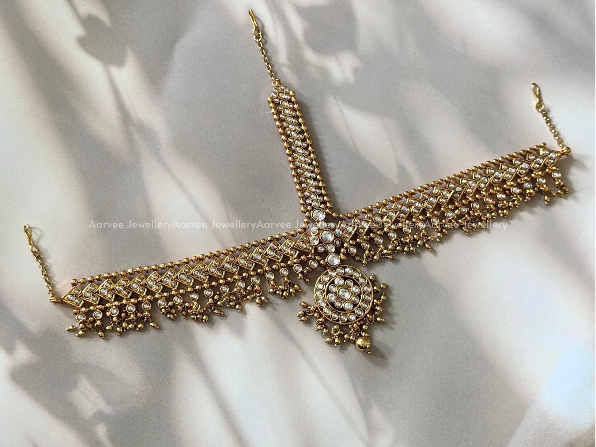 ANTIQUE FINISH KUNDAN WHITE STONE MATHAPATHI WITH ROUND PENDANT IN GOLD BEADS