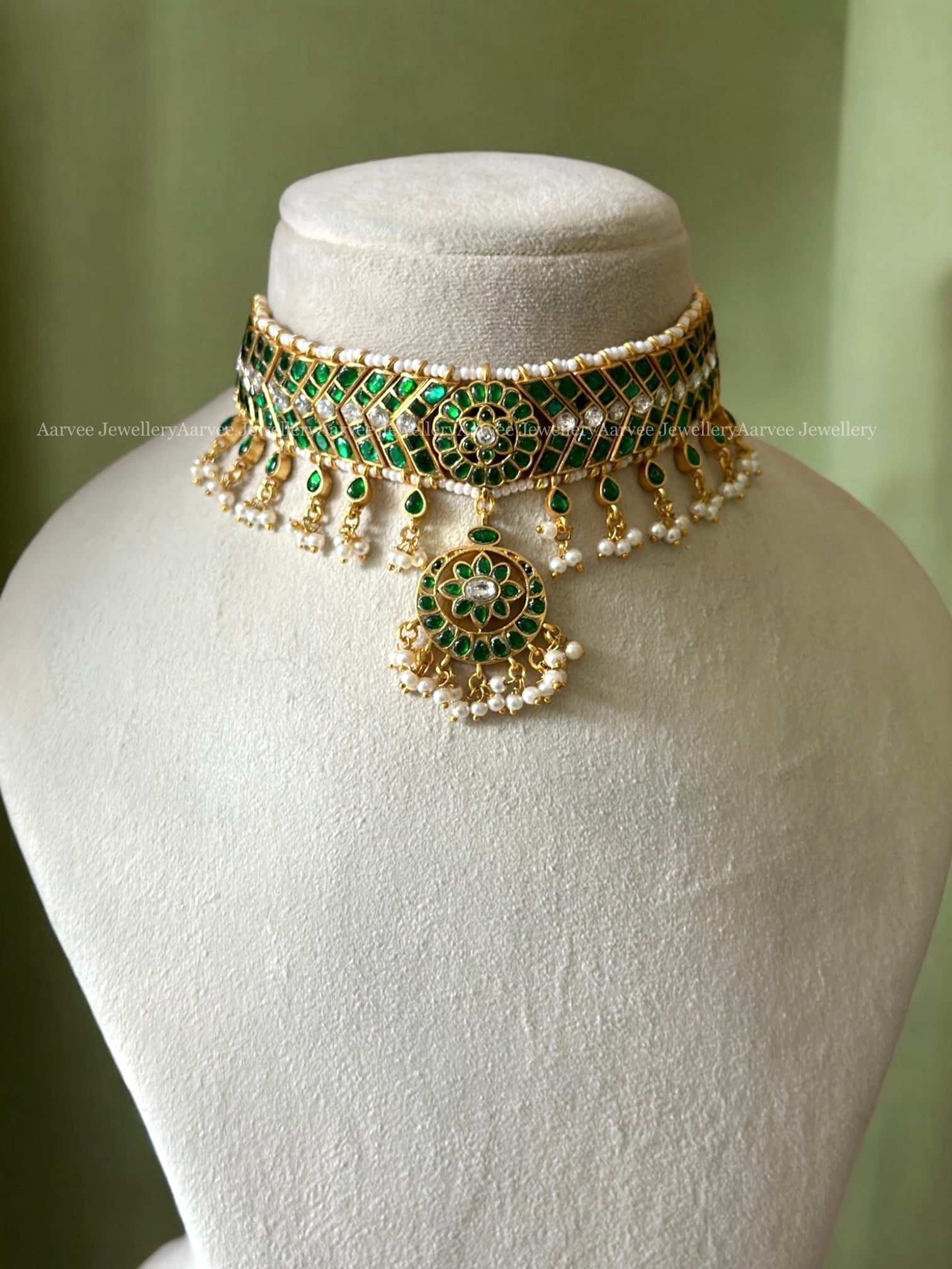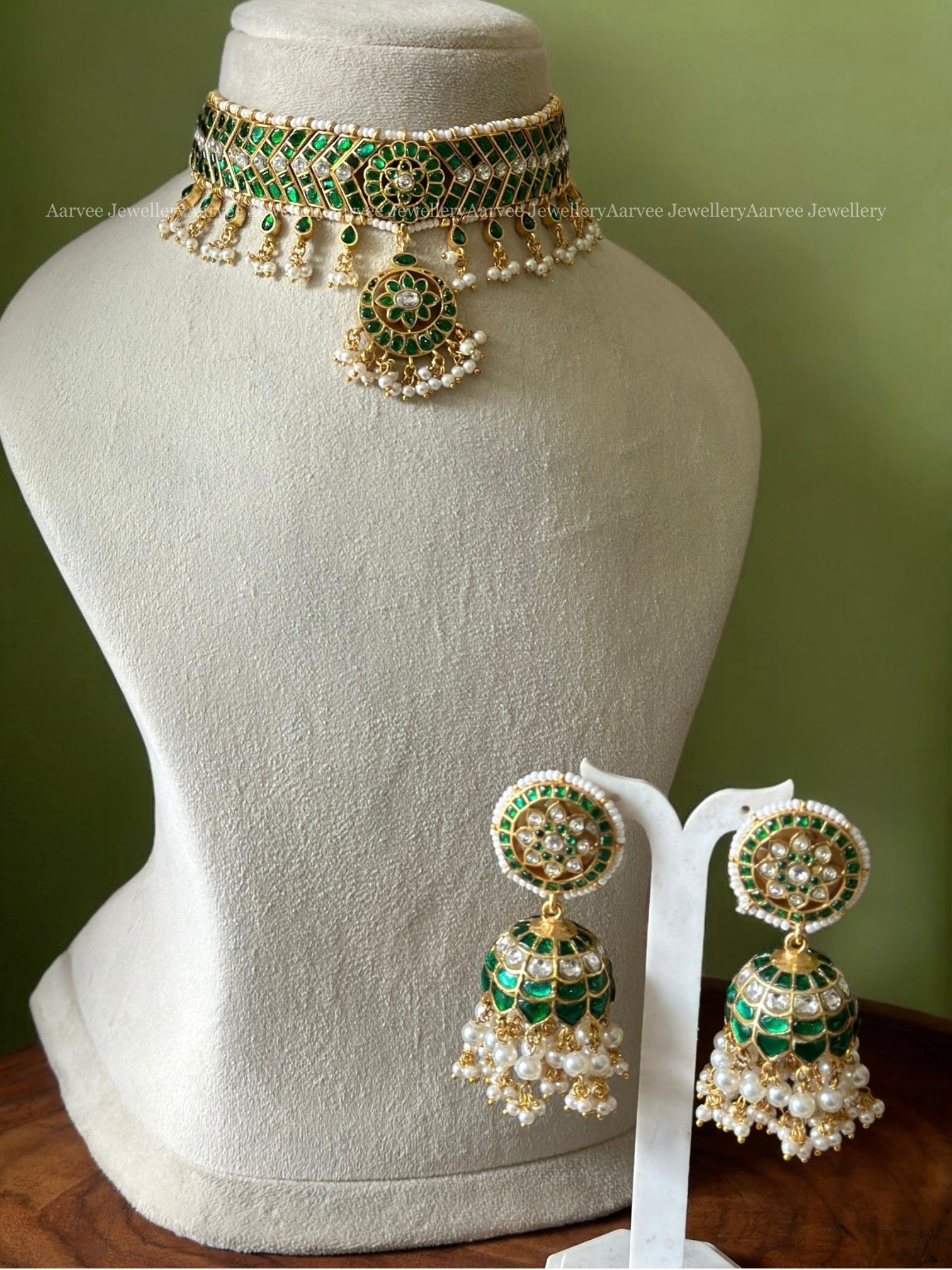 GREEN STONE CHOKER SET PAIRED WITH A BIG SIZED BUTTA JHUMKI WITH PEARLS