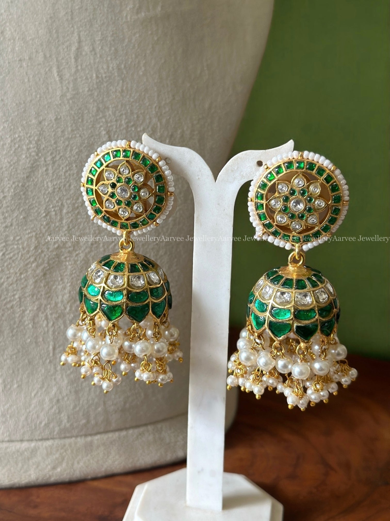 Traditional green choker necklace set with intricately designed large butta jhumkis and pearl embellishments
