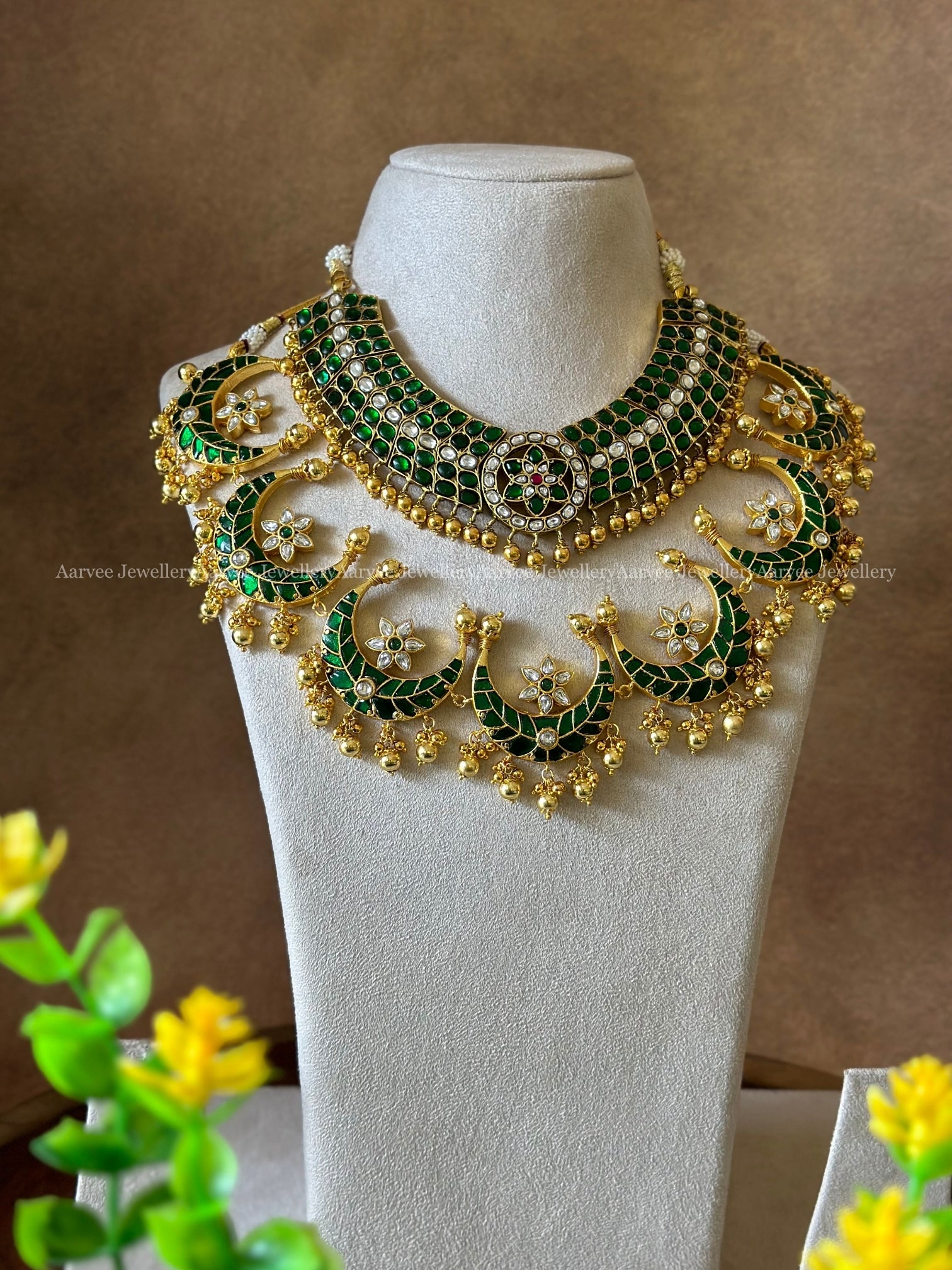 COMBO - EXQUISITE JADAU KUNDAN STATEMENT JEWELLERY | GREEN STONES BUTTA CHOKER AND 7 CHAND PENDANT NECKLACE WITH GOLD BEADS