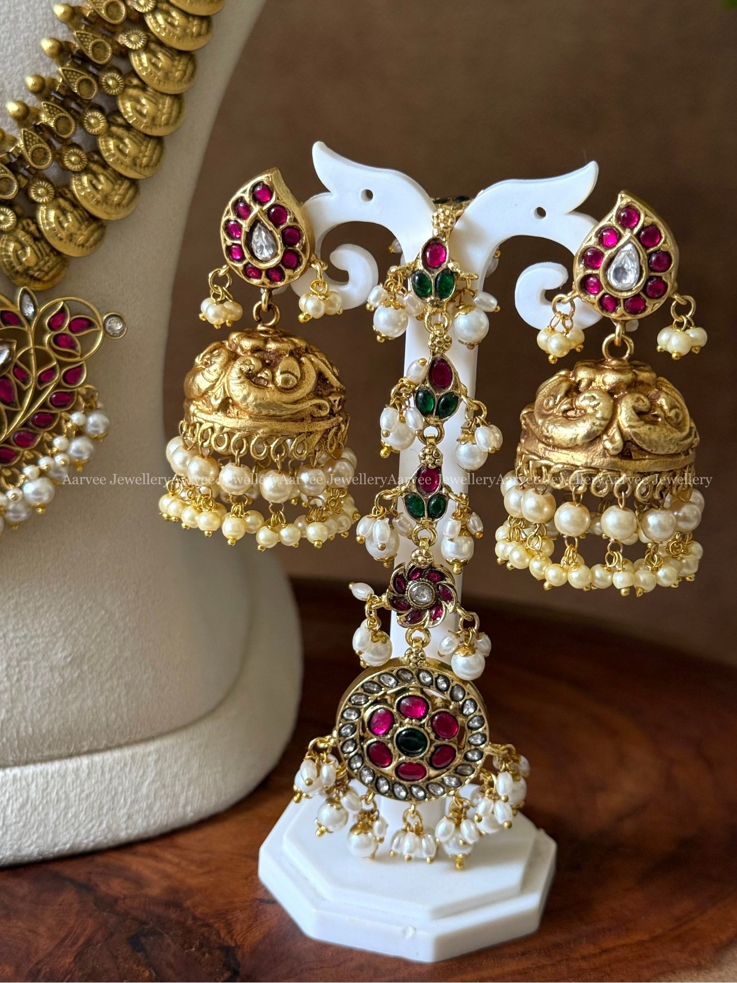Traditional Combo Set – Gold Bead Necklace with Rice Pearls, Mango Pendant Coin Chain, Matching Tikka & Jhumki