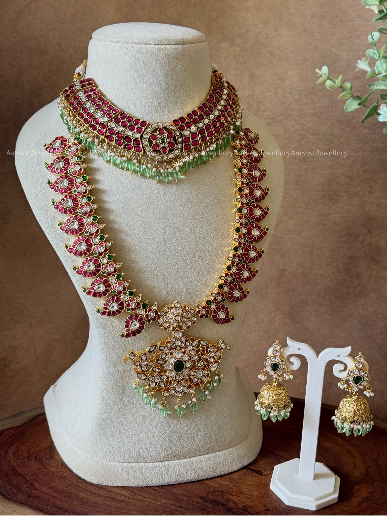 COMBO - JADAU KUNDAN RUBY STONE BUTTA CHOKER | JADAU KUNDAN RUBY STONE MANGO MOTIF MID LENGTH HARAM SET WITH WHITE STONE PENDANT & PASTAL BEADS