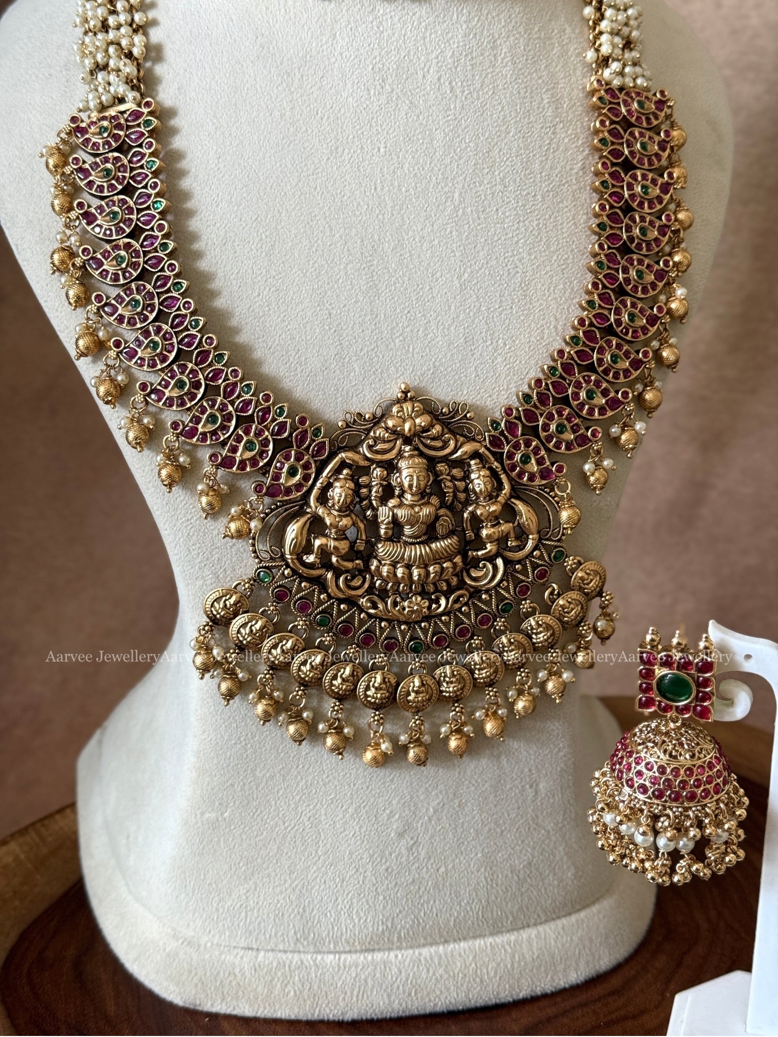 The set Contains: 1 Choker, 1 Haram and 1 Pair of earrings.