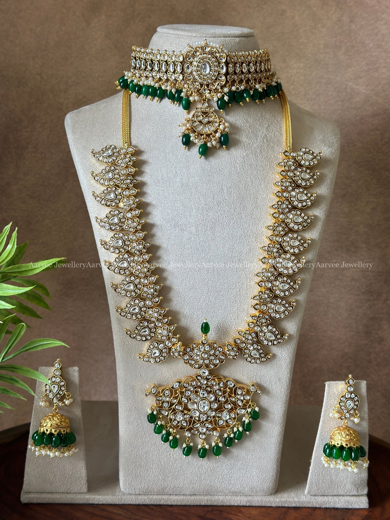 Traditional Combo – White Stone Kemp Choker & Jadau Kundan Mid-Length Haram with Green Beading