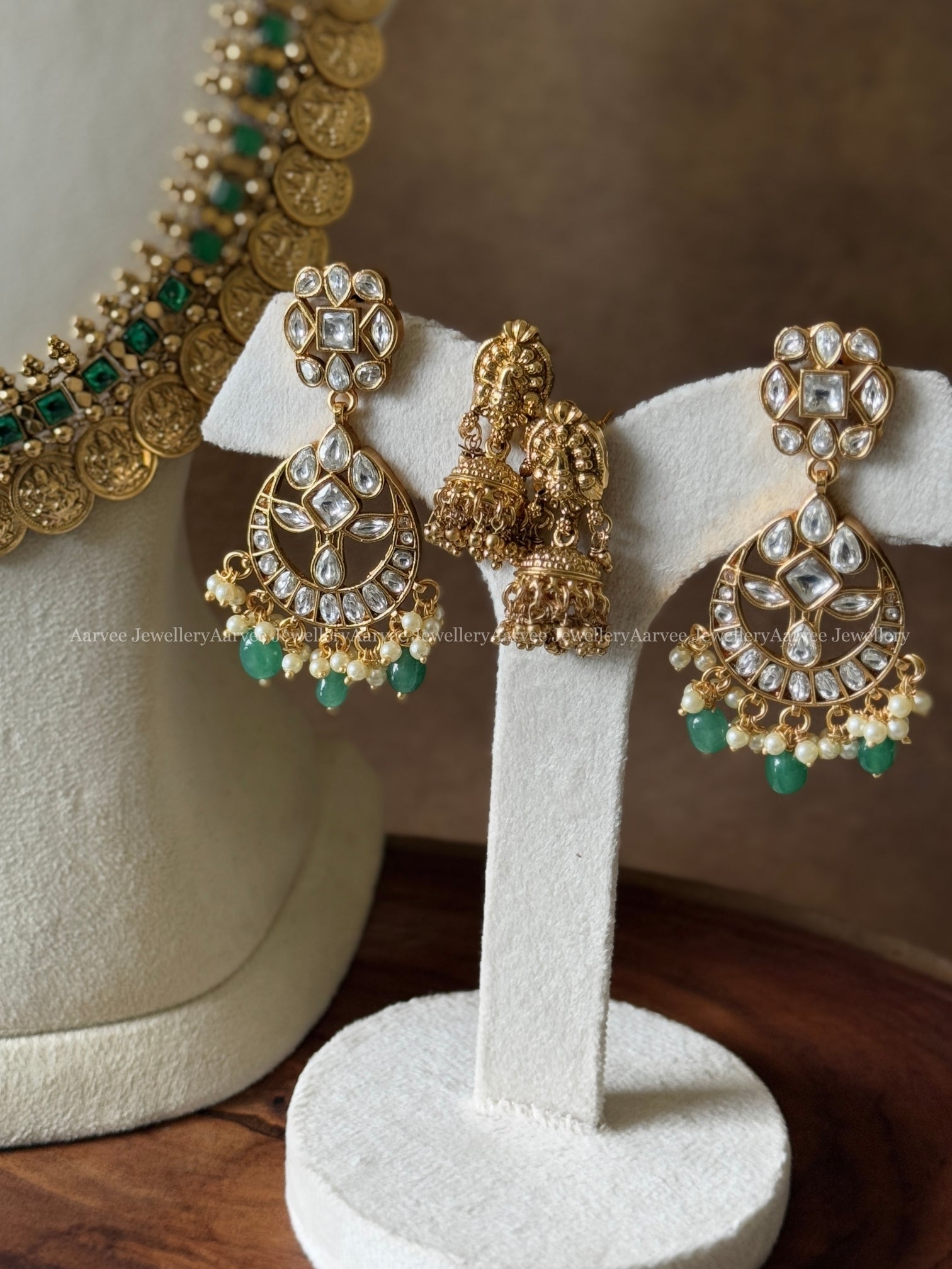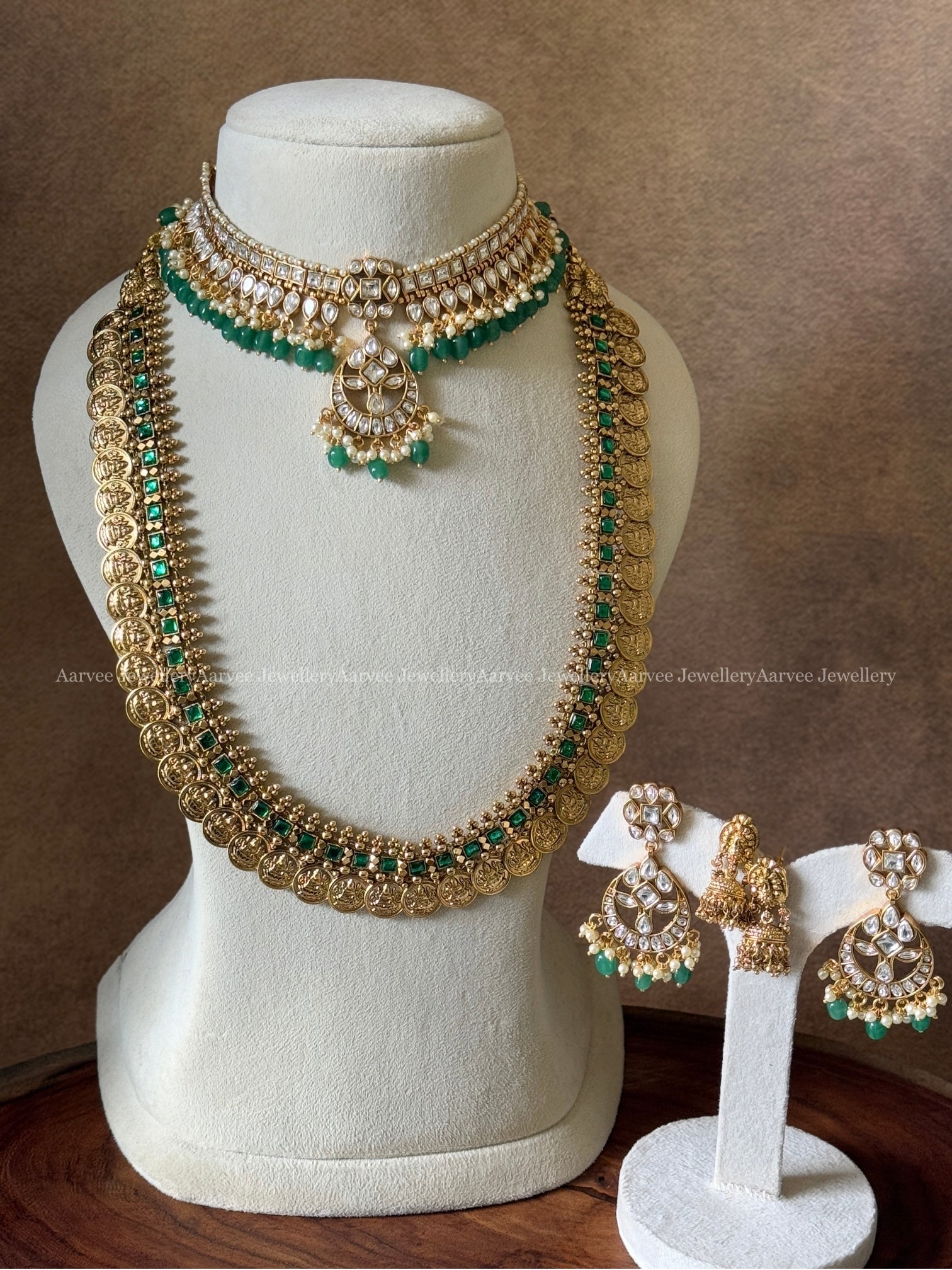 COMBO- SEMI PRECIOUS KUNDAN CHOKER WITH HIGH QUALITY ANTIQUE FINISH LAKSHMI COIN MID LENGTH HARAM SET WITH GREEN STONE