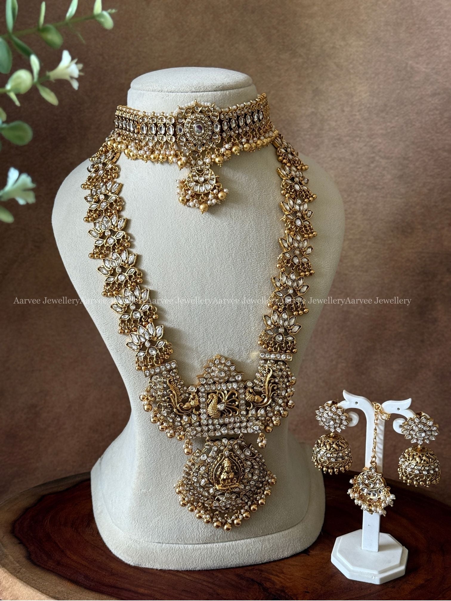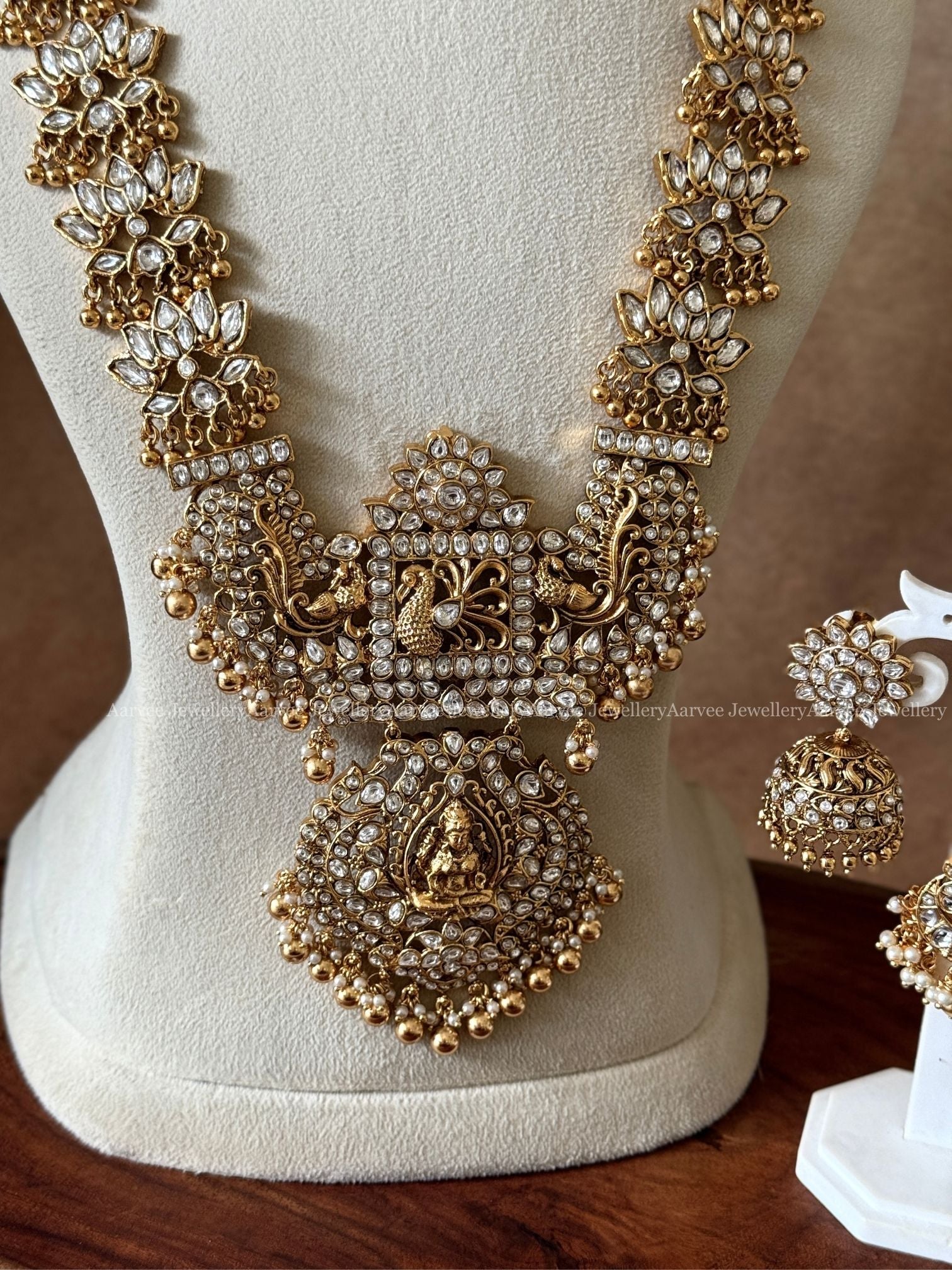 Jewelry Combo – White Kundan Stone Choker and Matching Lotus Design Haram Set with Peacock Lakshmi Pendant, Accented by Pearls and Gold Beads