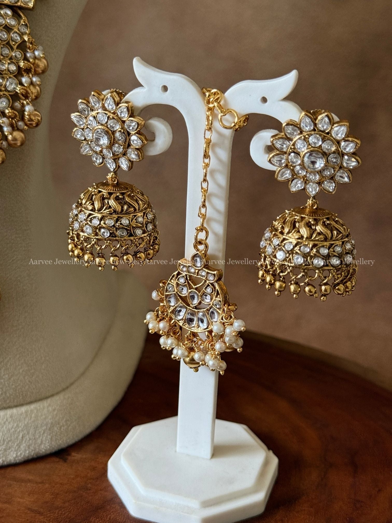 The set Contains: 1 Choker, 1 Haram, 1Tikka and 1 Pair of earrings.