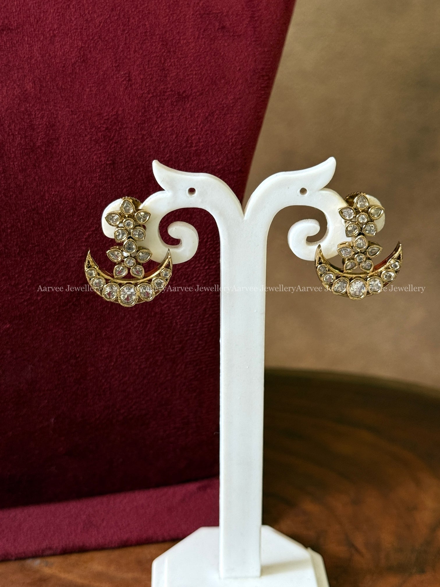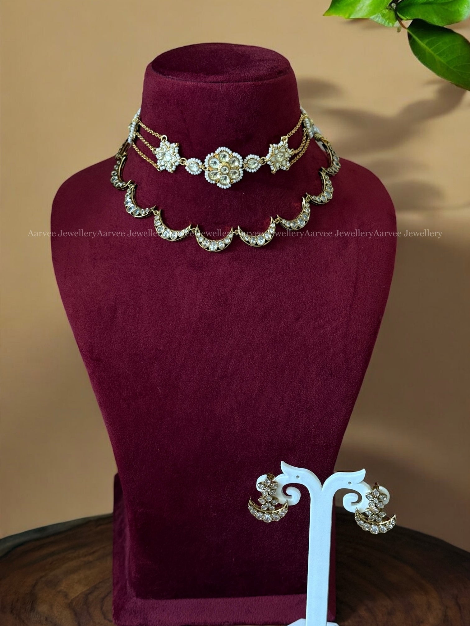 COMBO — WHITE STONES KUNDAN GOLD CHAIN FLORAL CHOKER STYLED WITH MOON / CHAND DESIGN MINIMAL NECKLACE SET