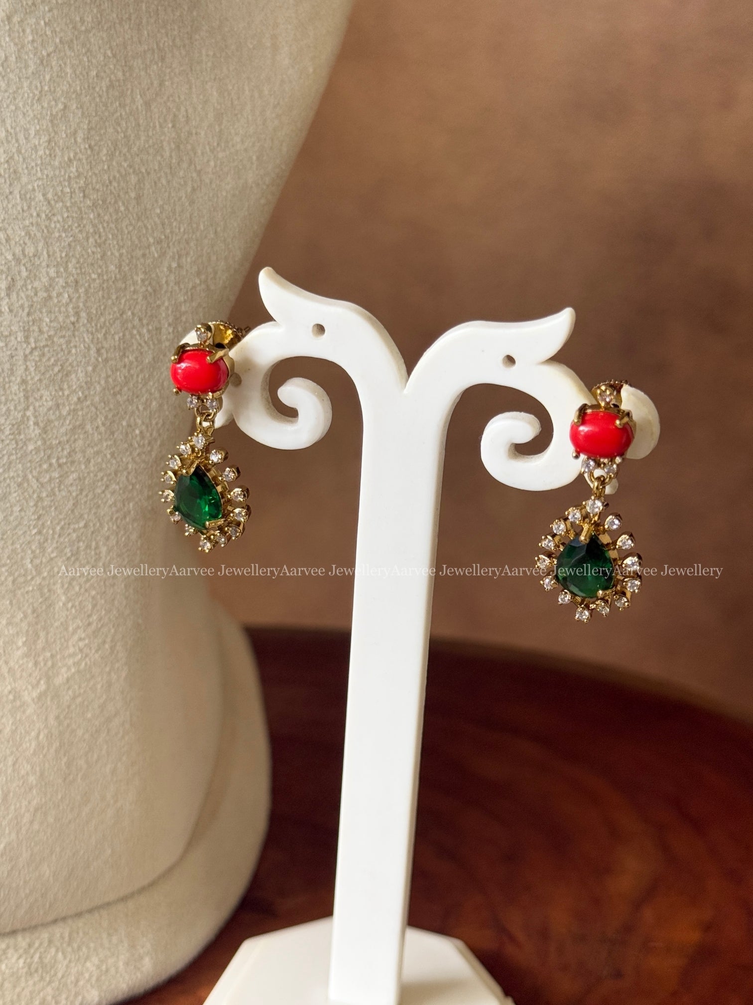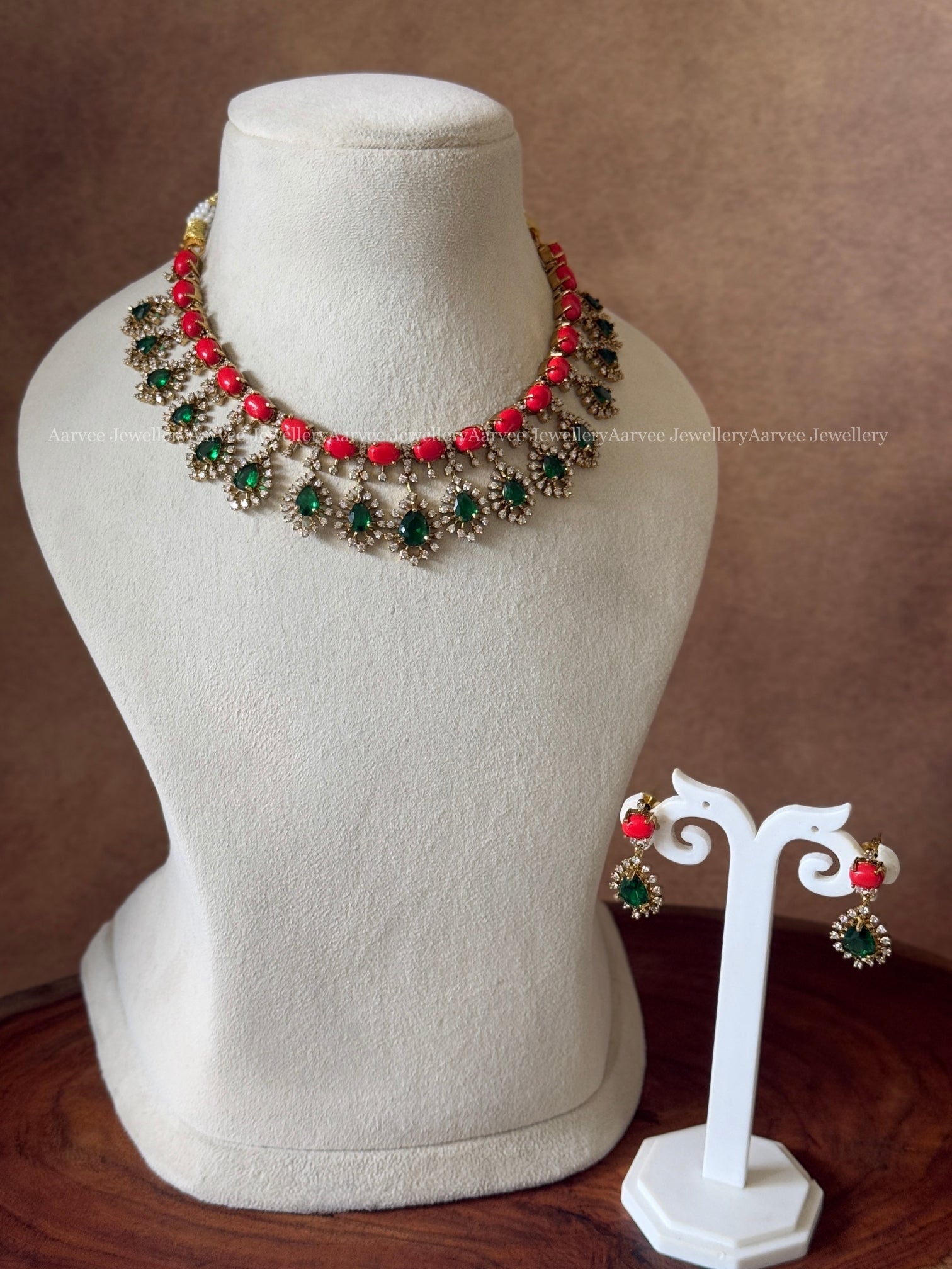 Dual-Tone Necklace Set with Coral Accents and Brilliant Green CZ Embellishments.