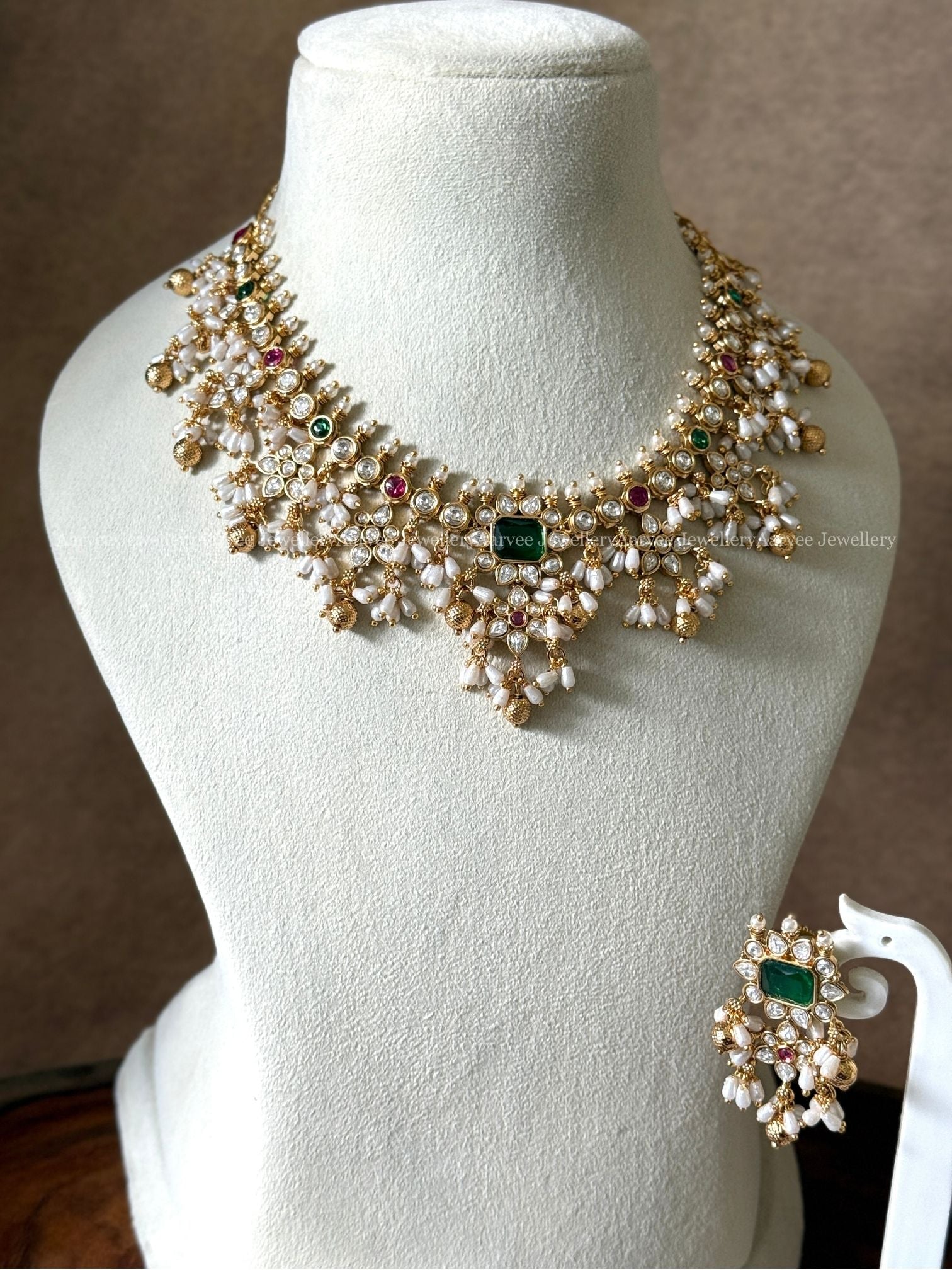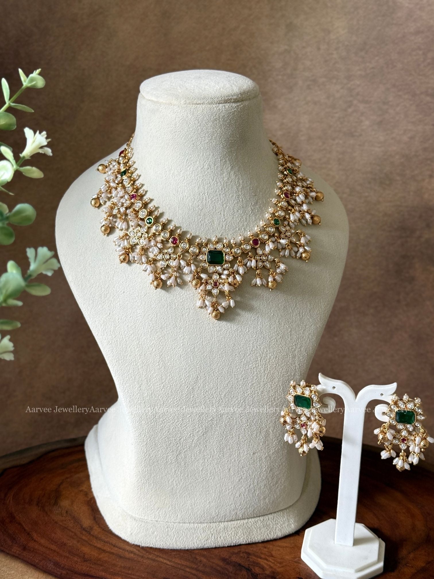 CZ FLORAL GUTTA PUSALU GREEN STONE NECKLACE SET