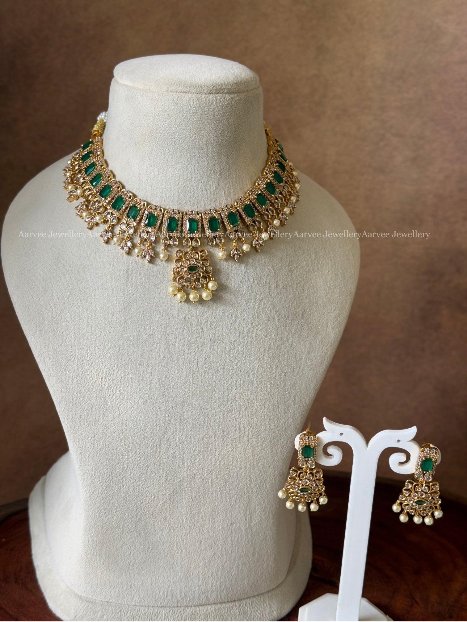 CZ GREEN STONE NECKLACE SET WITH PEARL BEADS