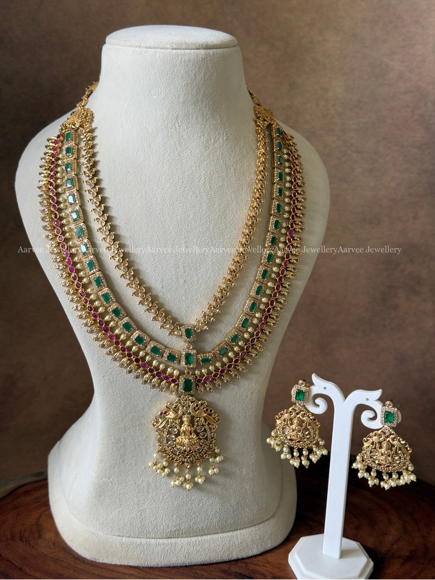 CZ RUBY / GREEN STONE LAYERED MID LENGTH HARAM SET WITH LAKSHMI PENDANT
