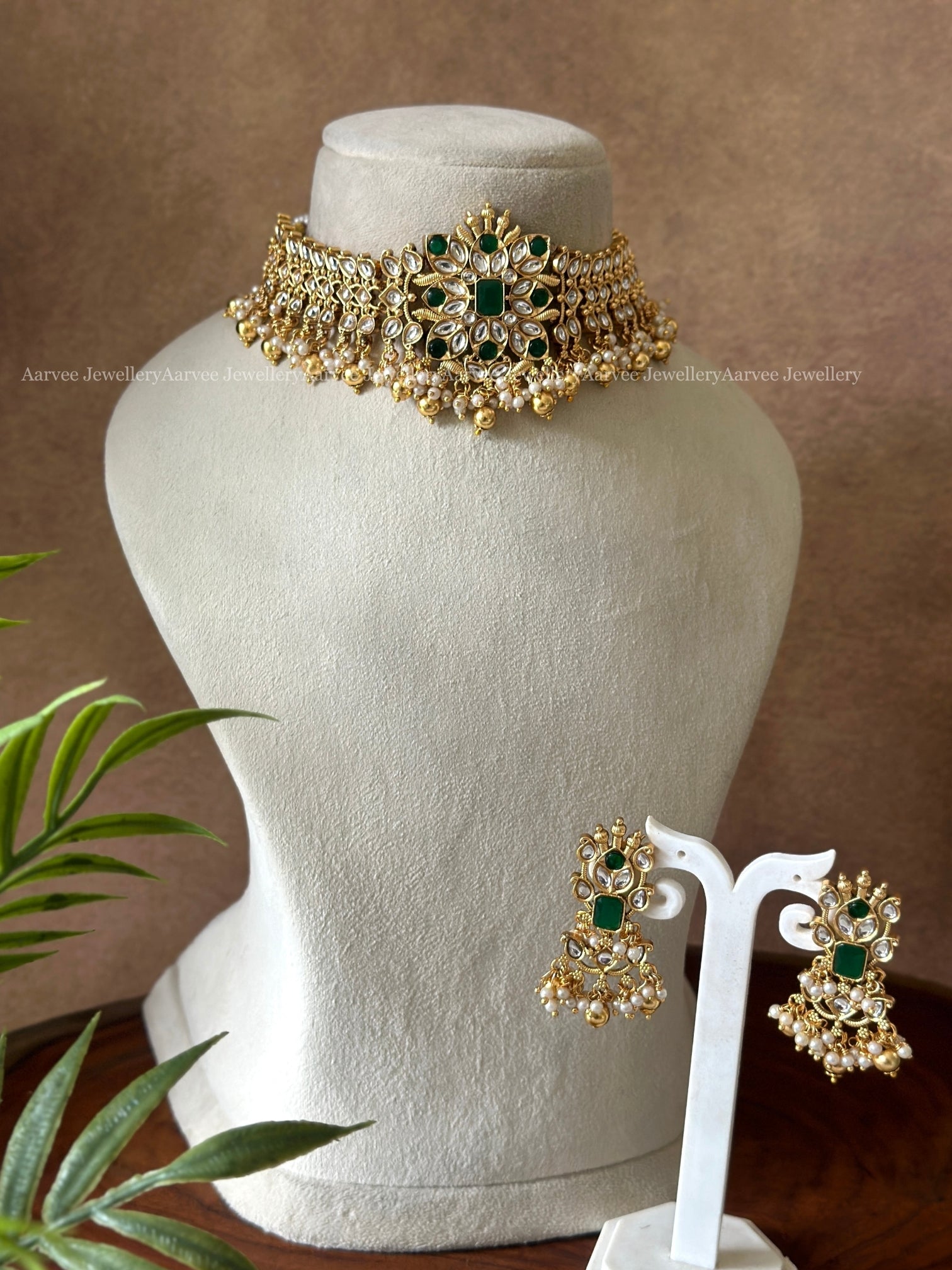 CZ WHITE / GREEN STONE HIGH NECK CHOKER SET WITH GOLD & PEARL BEADS