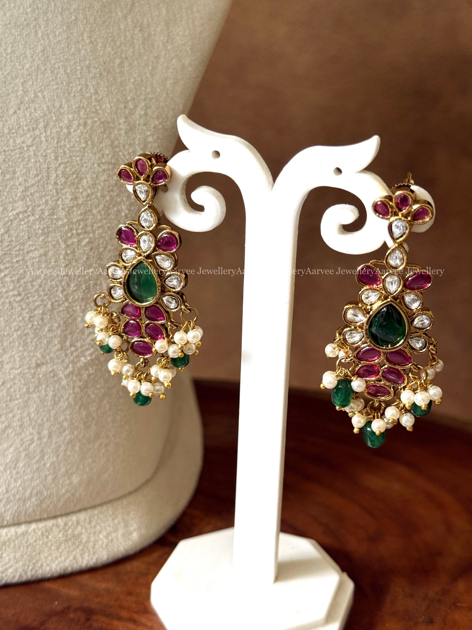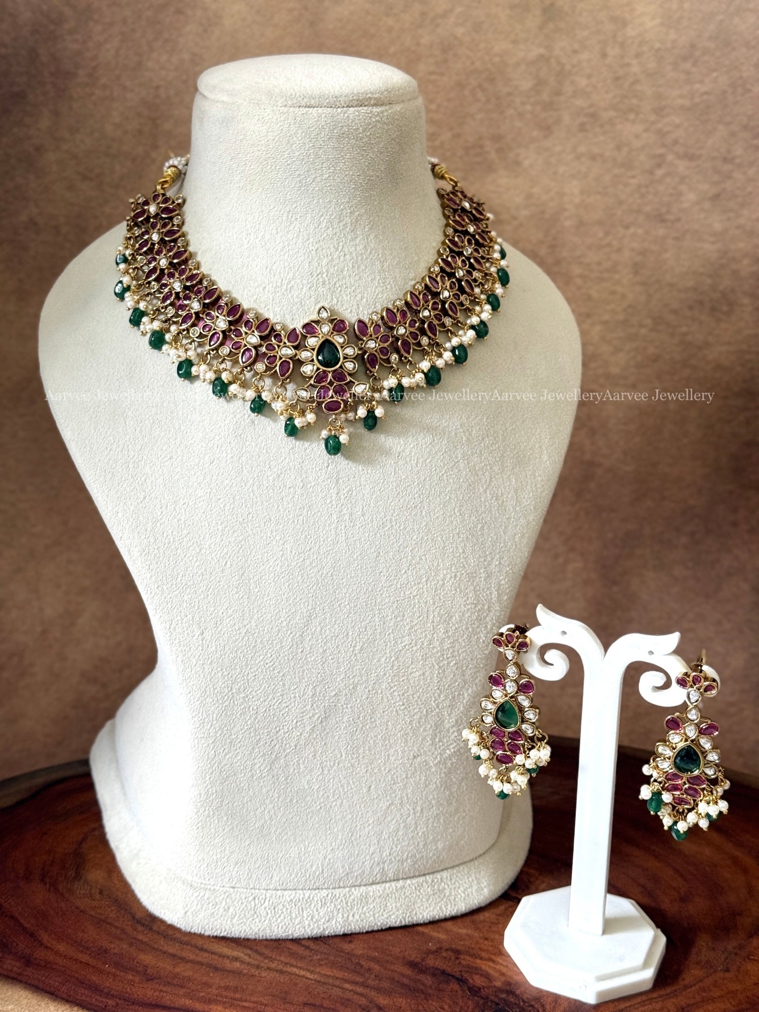 DEEP RUBY STONES FLORAL NECKLACE SET WITH GREEN BEADS