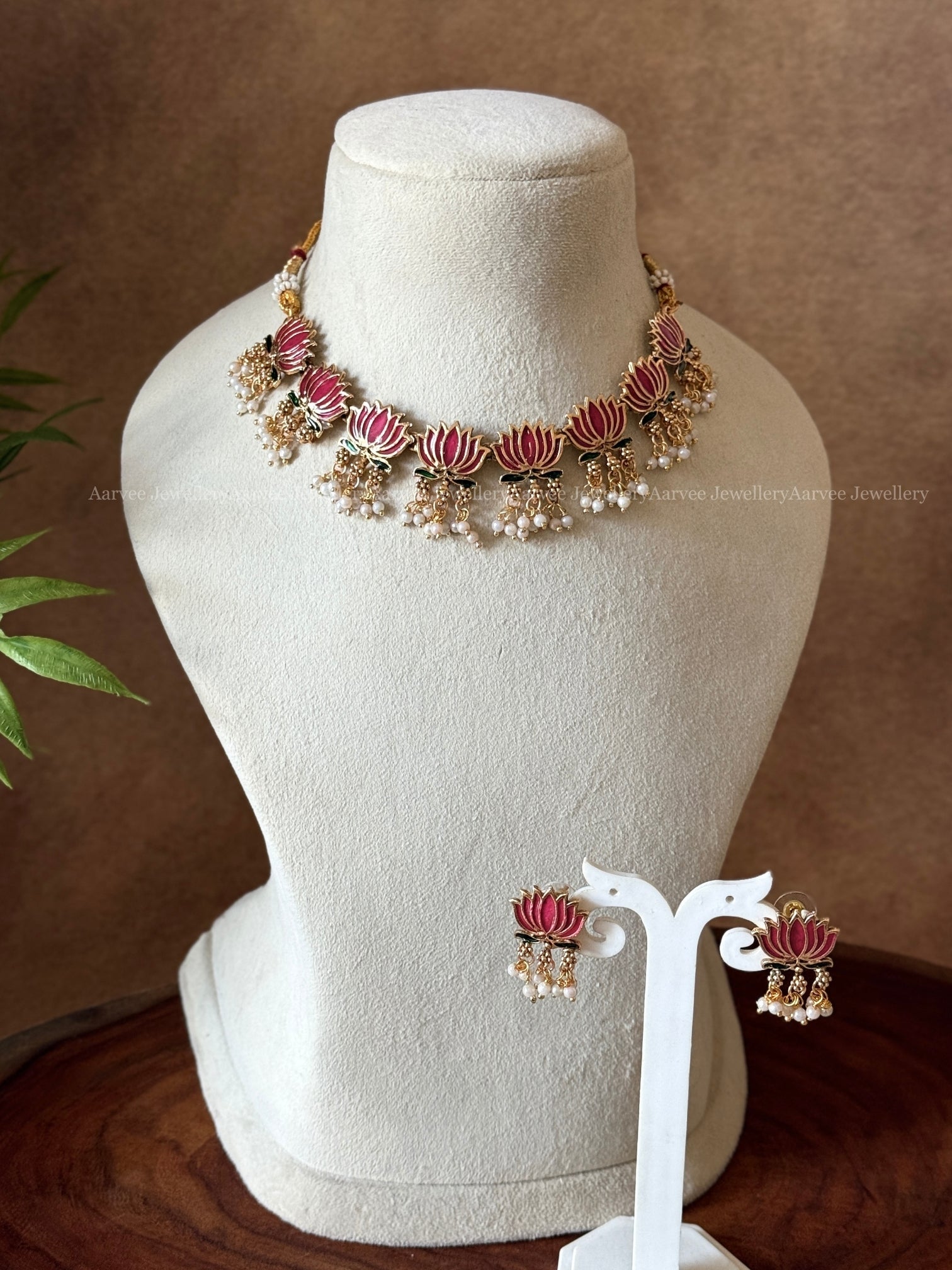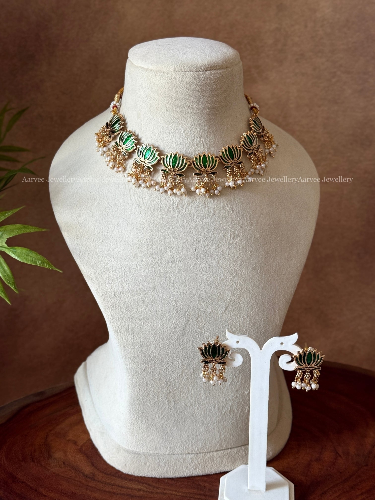 Elegant lotus-themed necklace set offered in two beautiful color options: green and pink