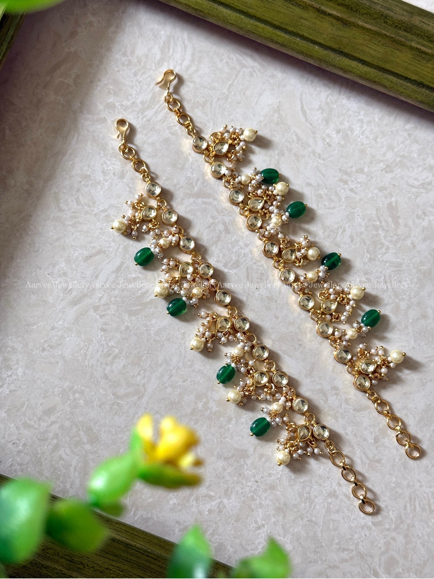 EAR CHAIN WITH WHITE KUNDAN STONE AND GREEN BEADS