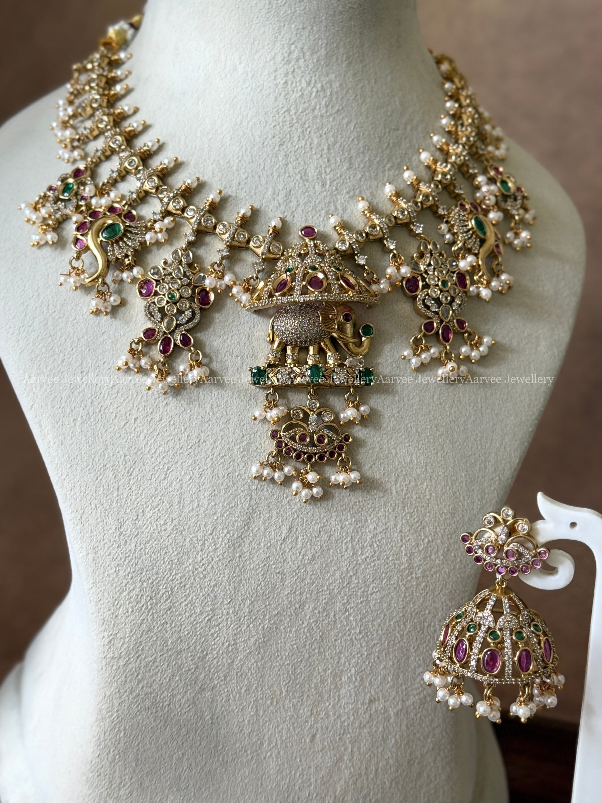 EXQUISITE MULTI COLOR CZ STONES ELEPHANT PENDANT NECKLACE SET