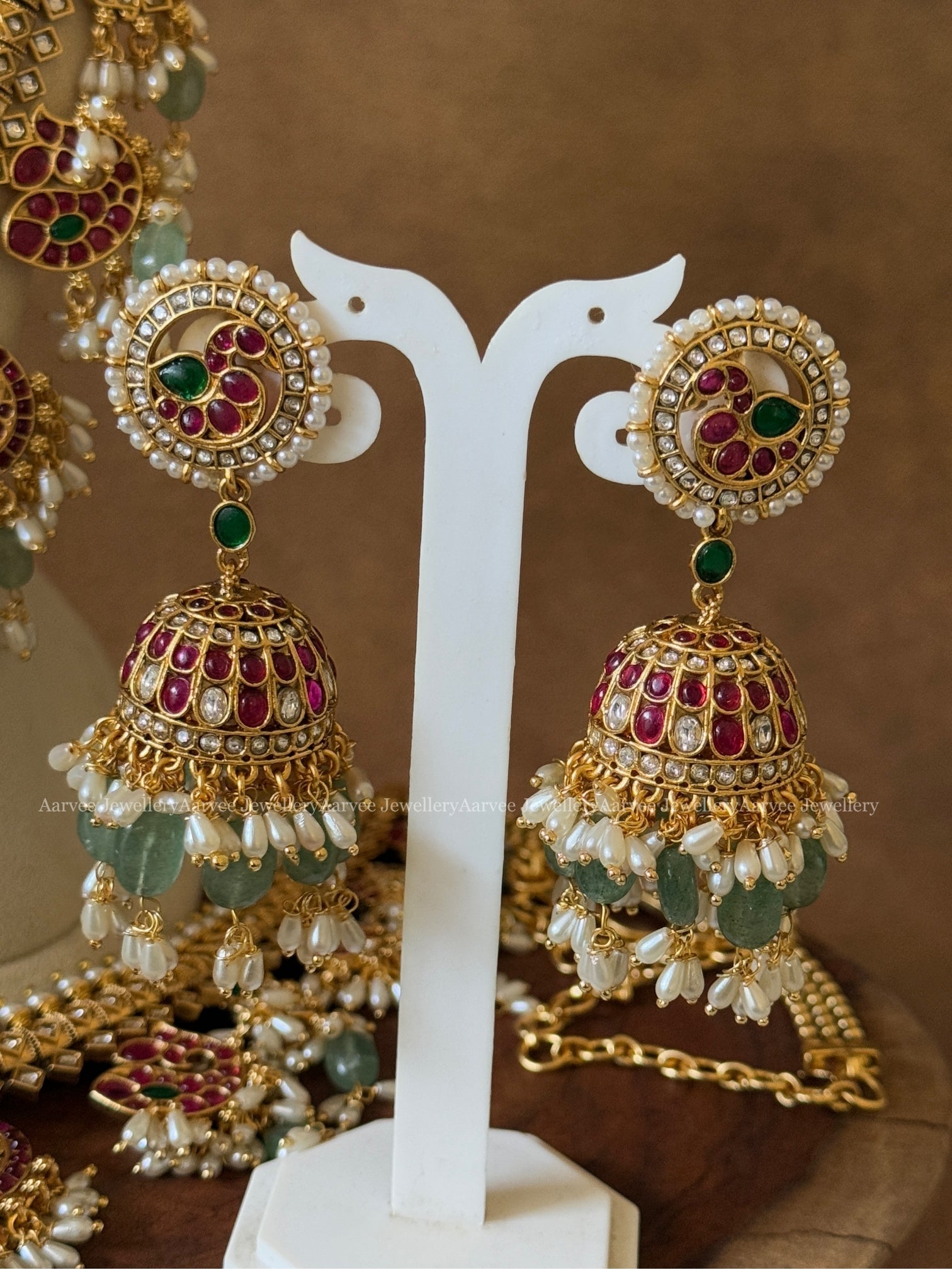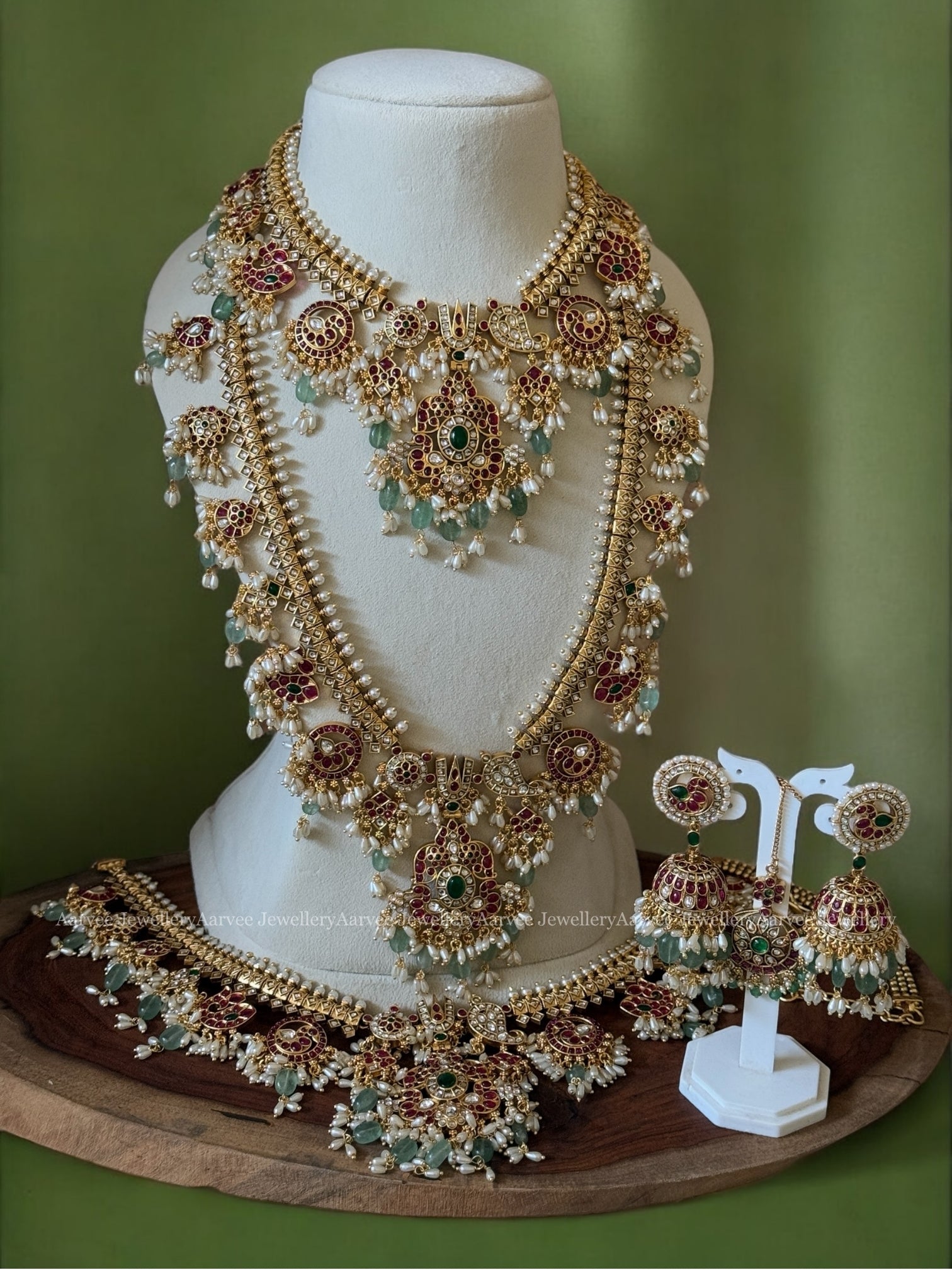 The set Contains : Necklace, Haram, Waist chain, Tikka & 1 pair of earrings
