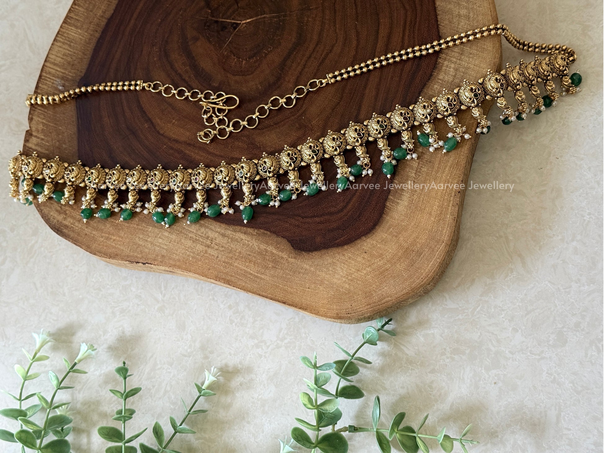 FULL GOLD PEACOCK MOTIF WASIT CHAIN WITH GREEN BEADS