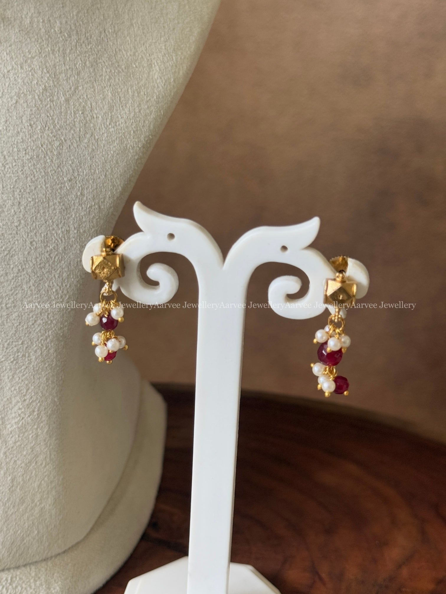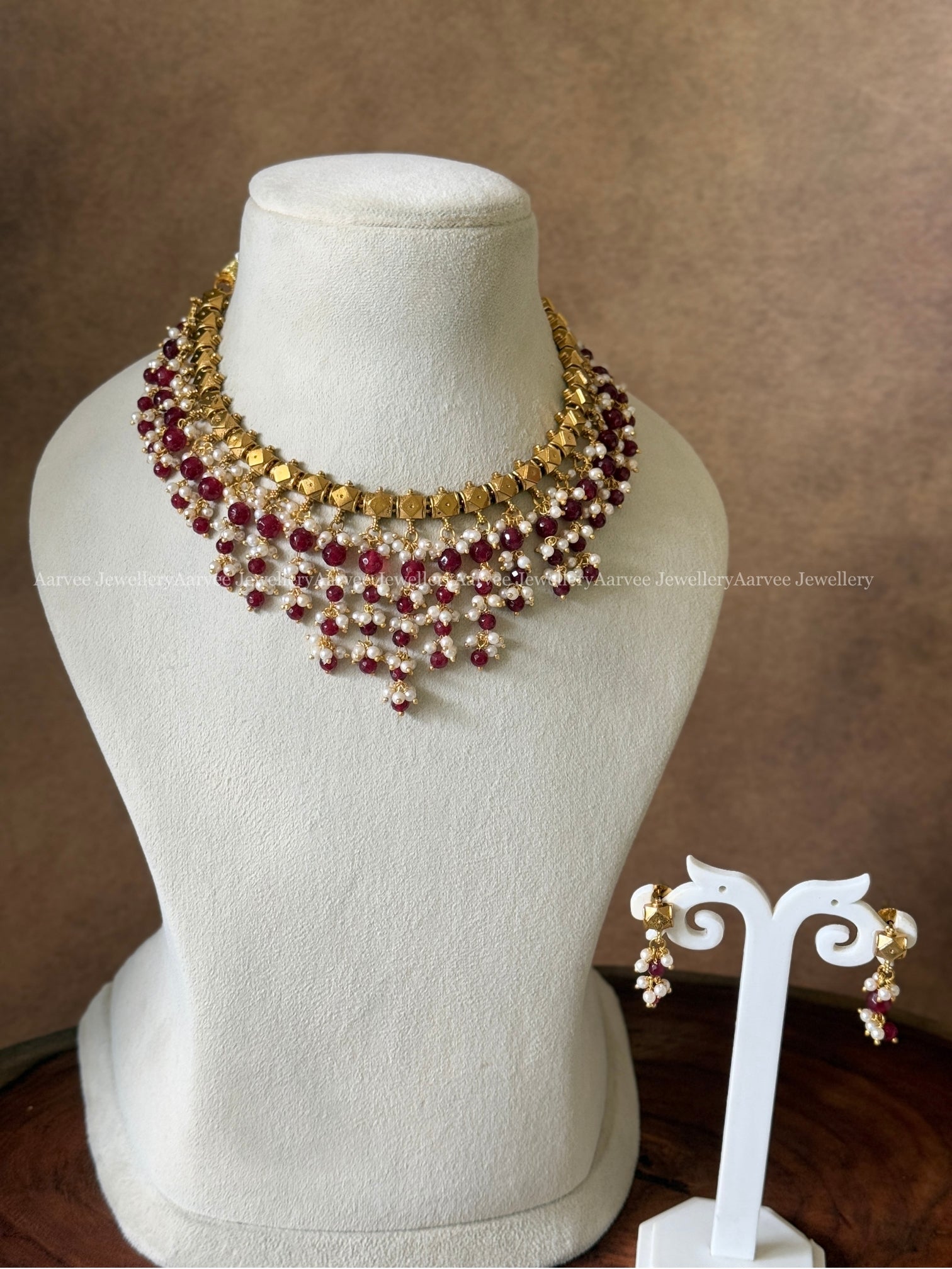 GOLD BALL BEAD NECKLACE WITH LAYERED RUBY BEAD DROPS