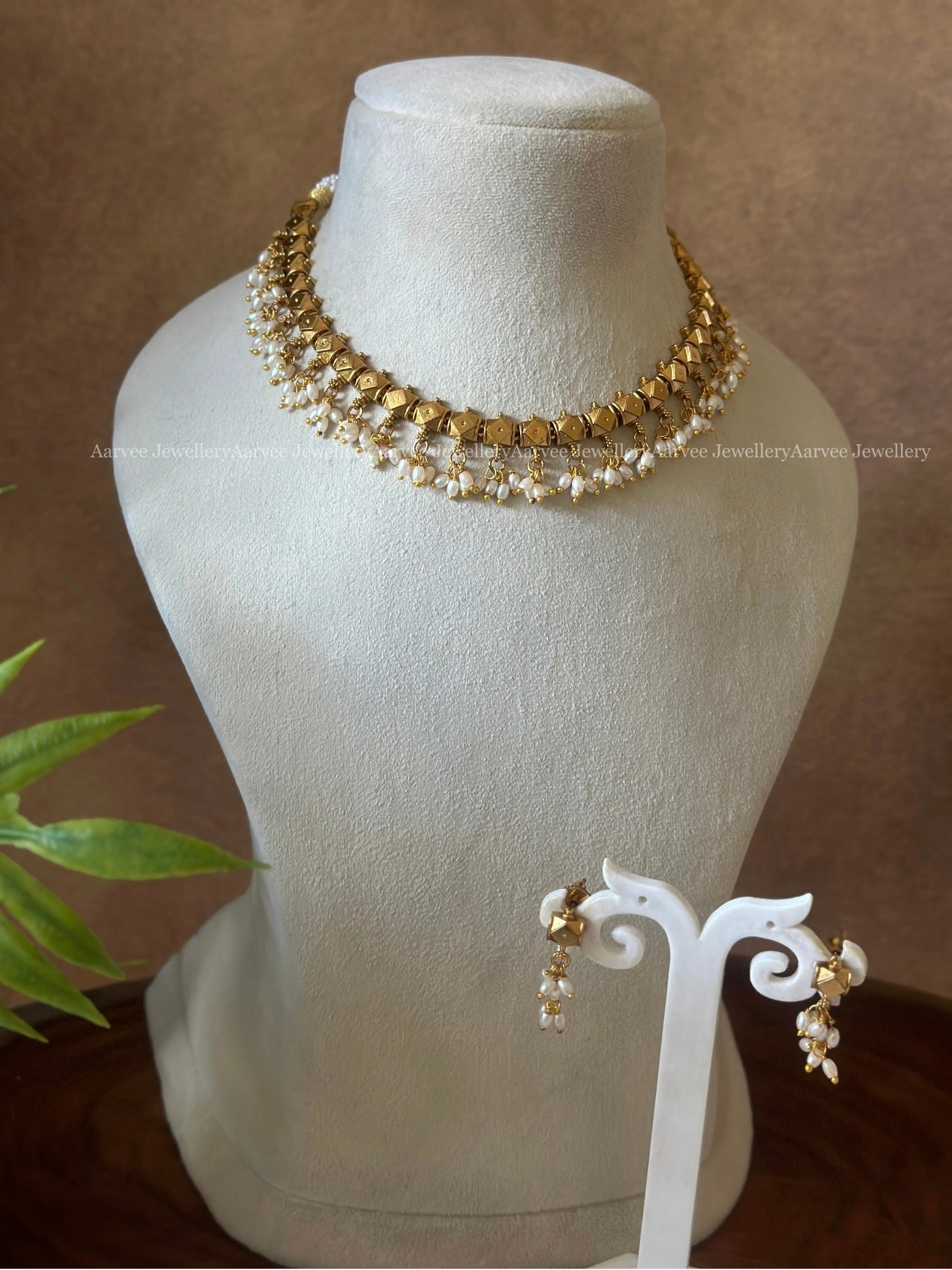Gold Ball Necklace Set Embellished with Rice Pearls