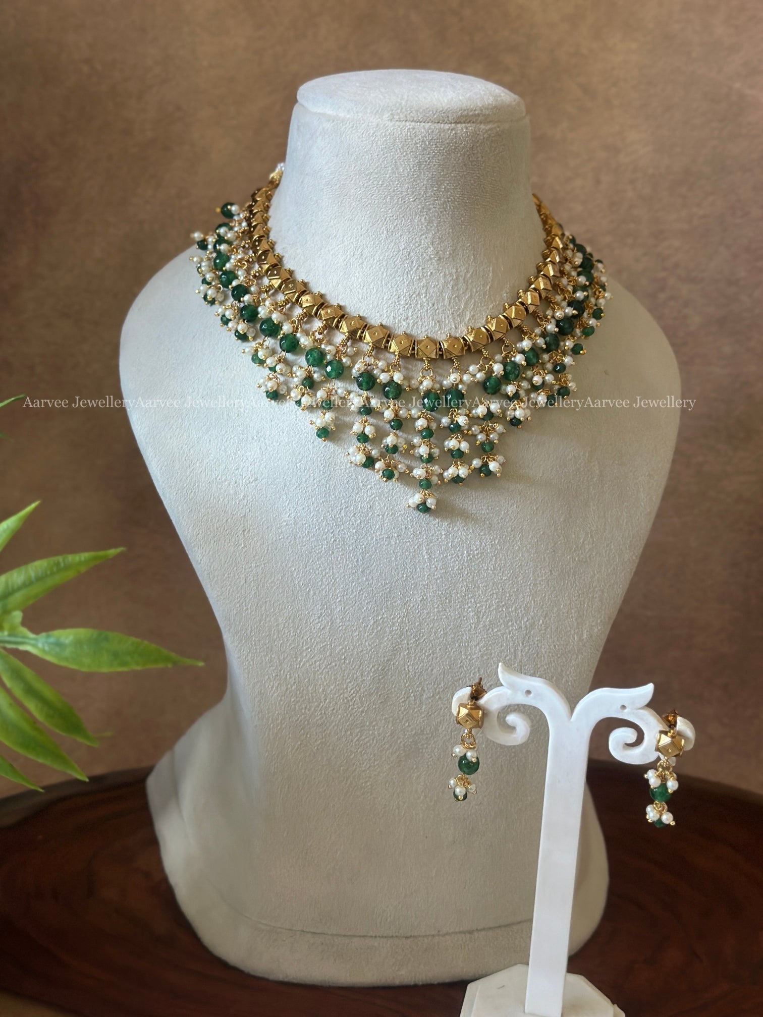 Statement Gold Necklace Set with Layered Green and Pearl Beads – A Contemporary Twist on Traditional Charm