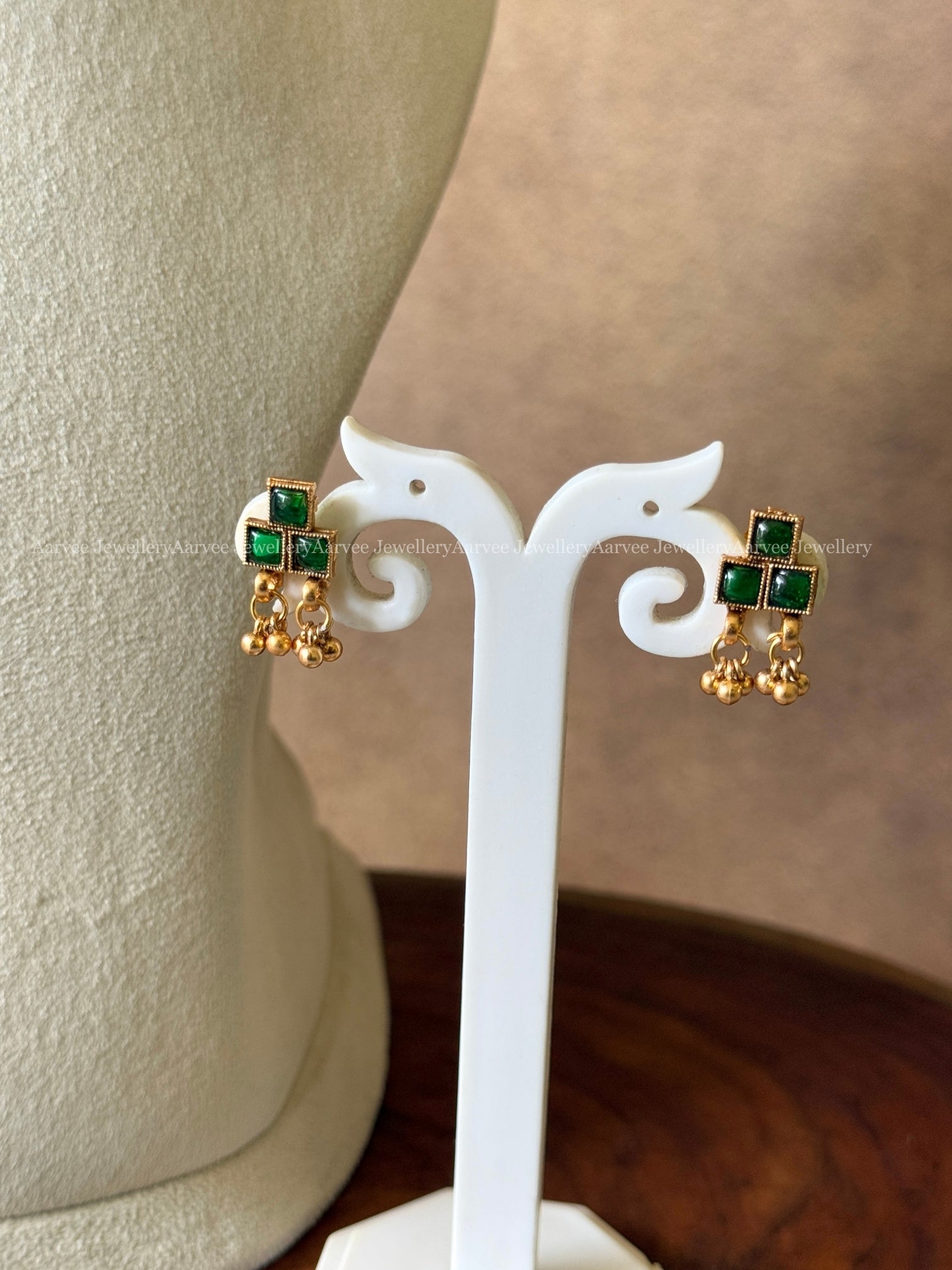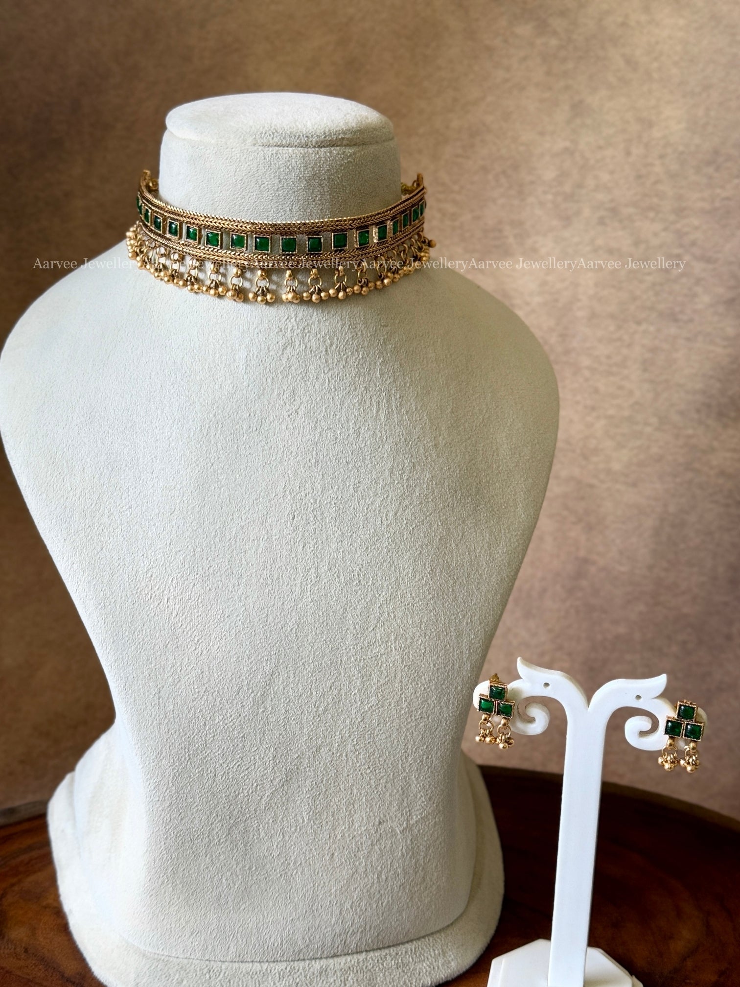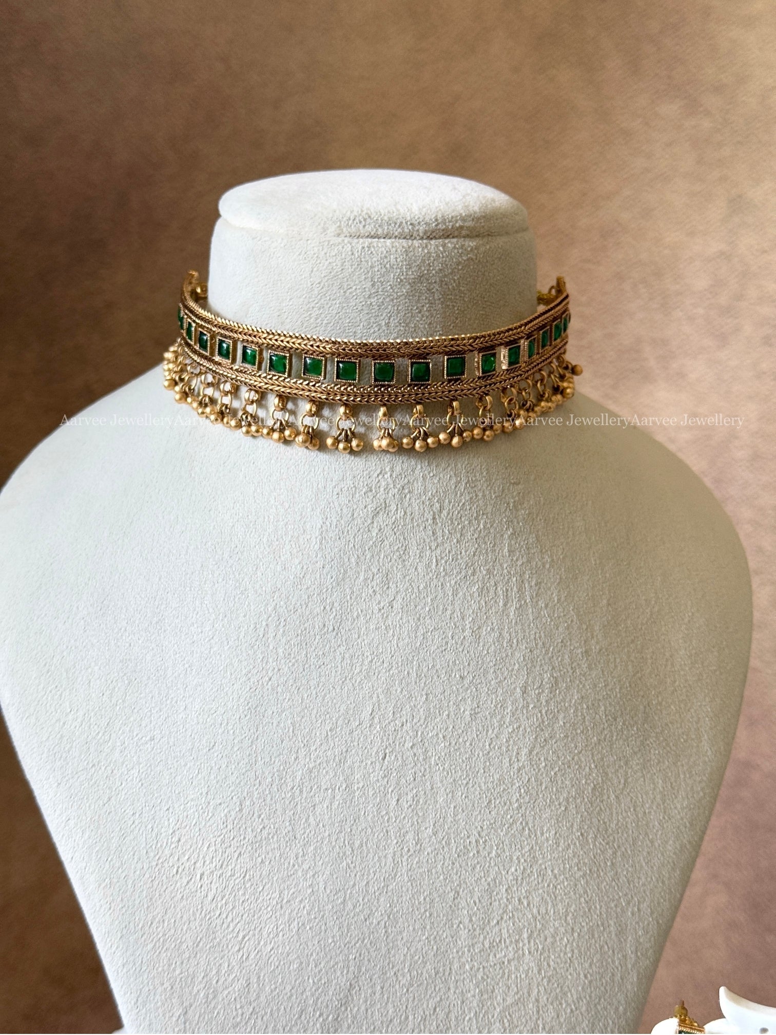 GOLD CHAIN CHOKER SET WITH GREEN STONES
