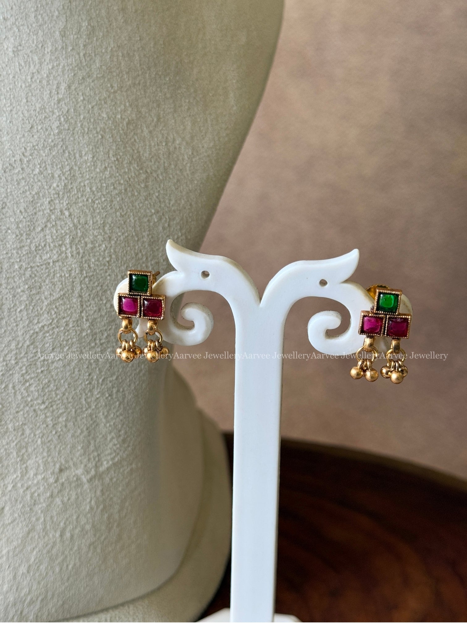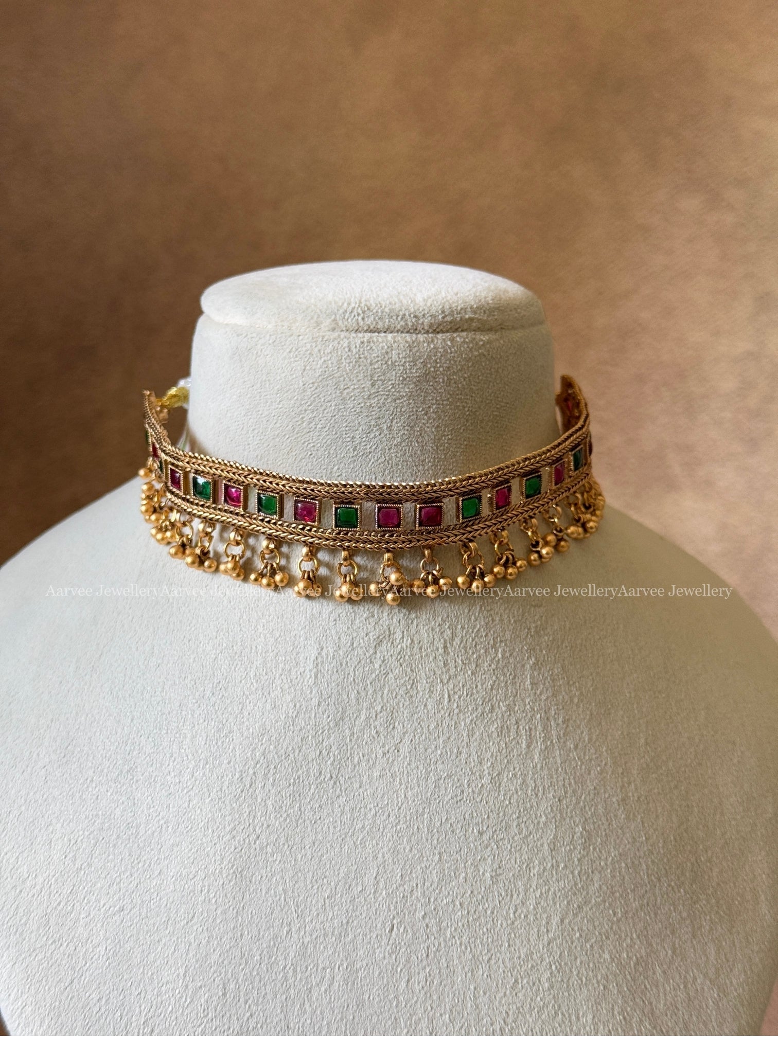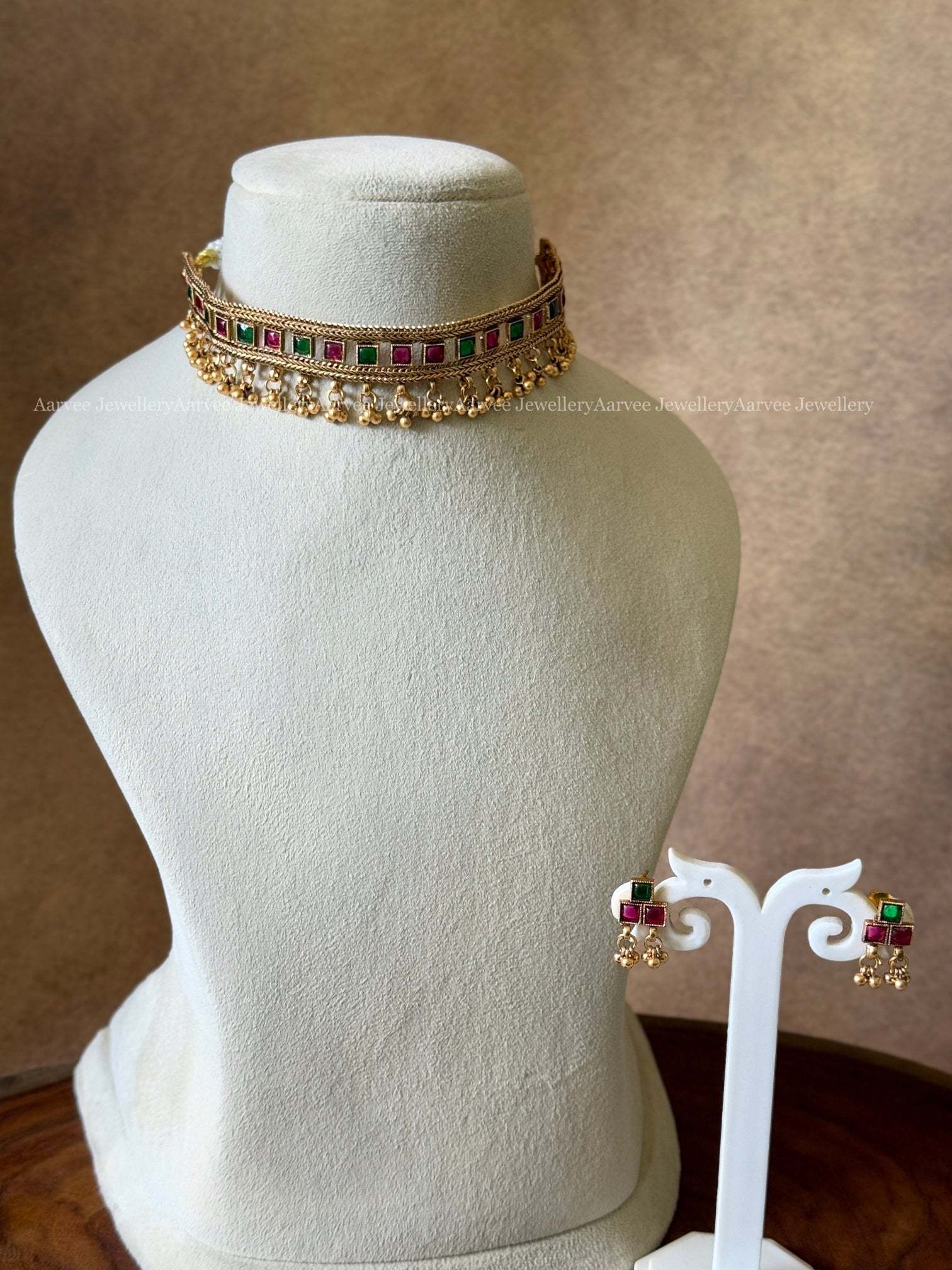 GOLD CHAIN CHOKER SET WITH RED / GREEN STONES