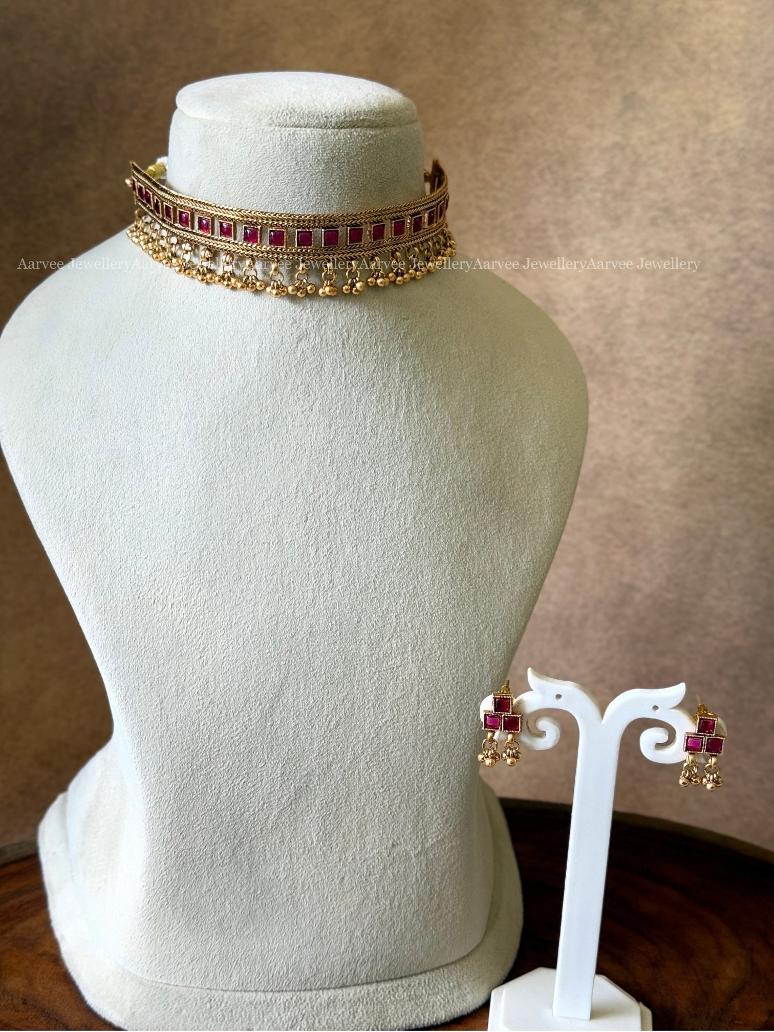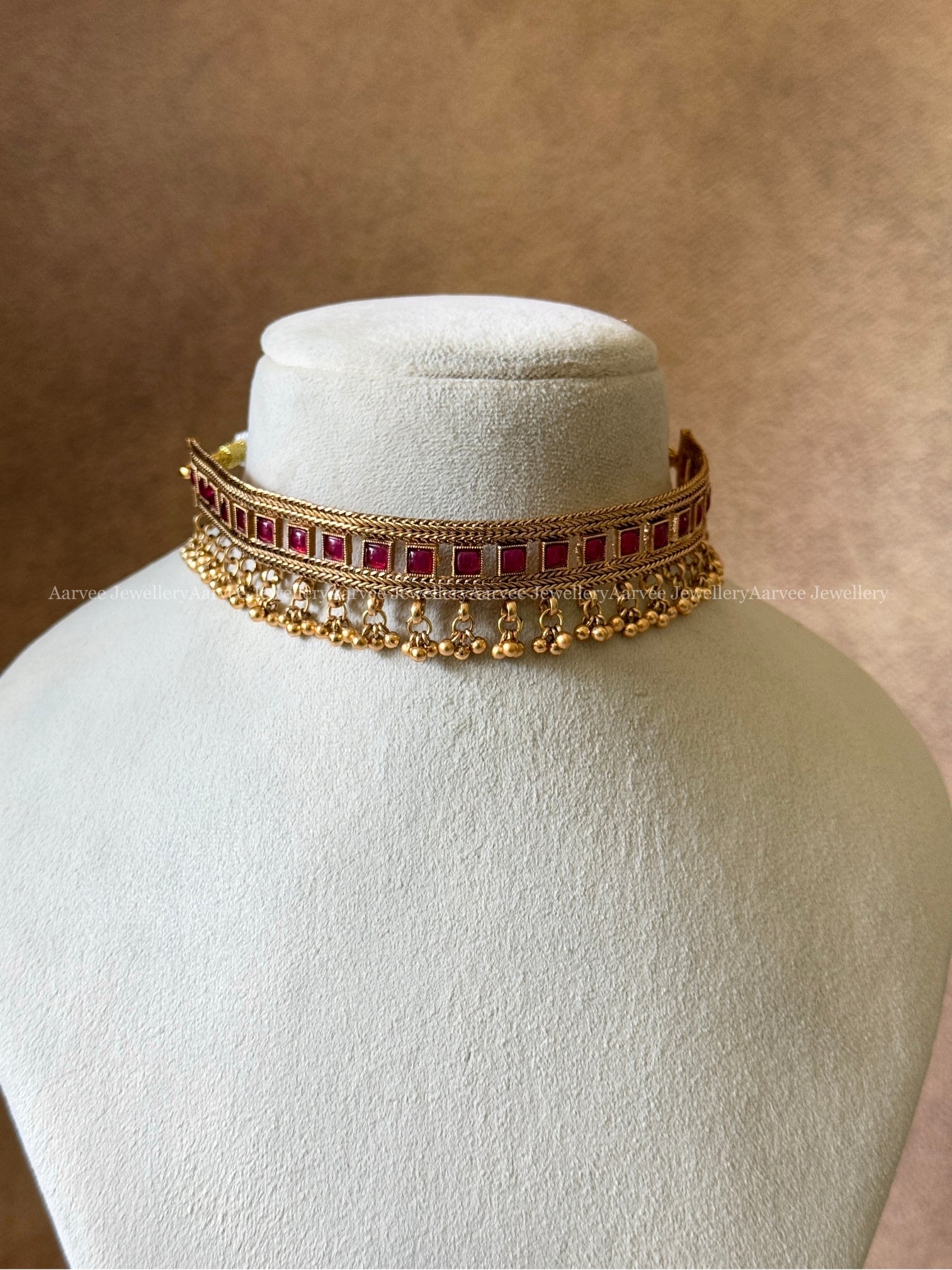 Traditional Gold Choker Set Embellished with Deep Red Stones