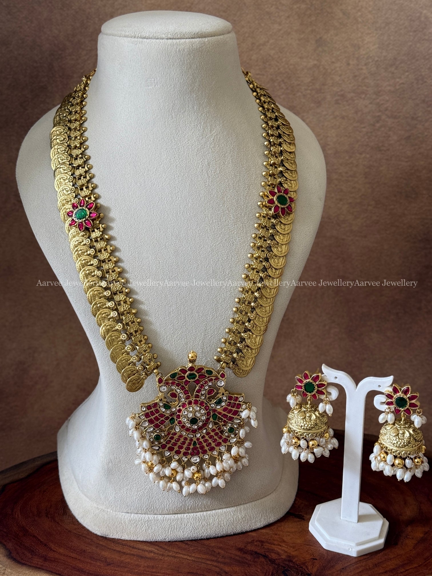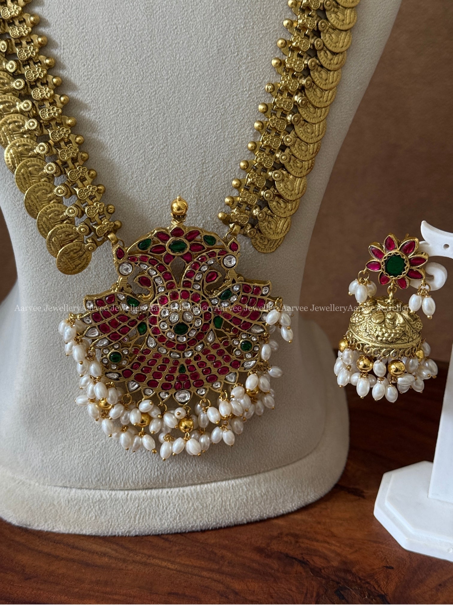 GOLD COIN MID LENGTH HARAM SET WITH PEACOCK PENDANT WITH PEARLS - RUBY STONES