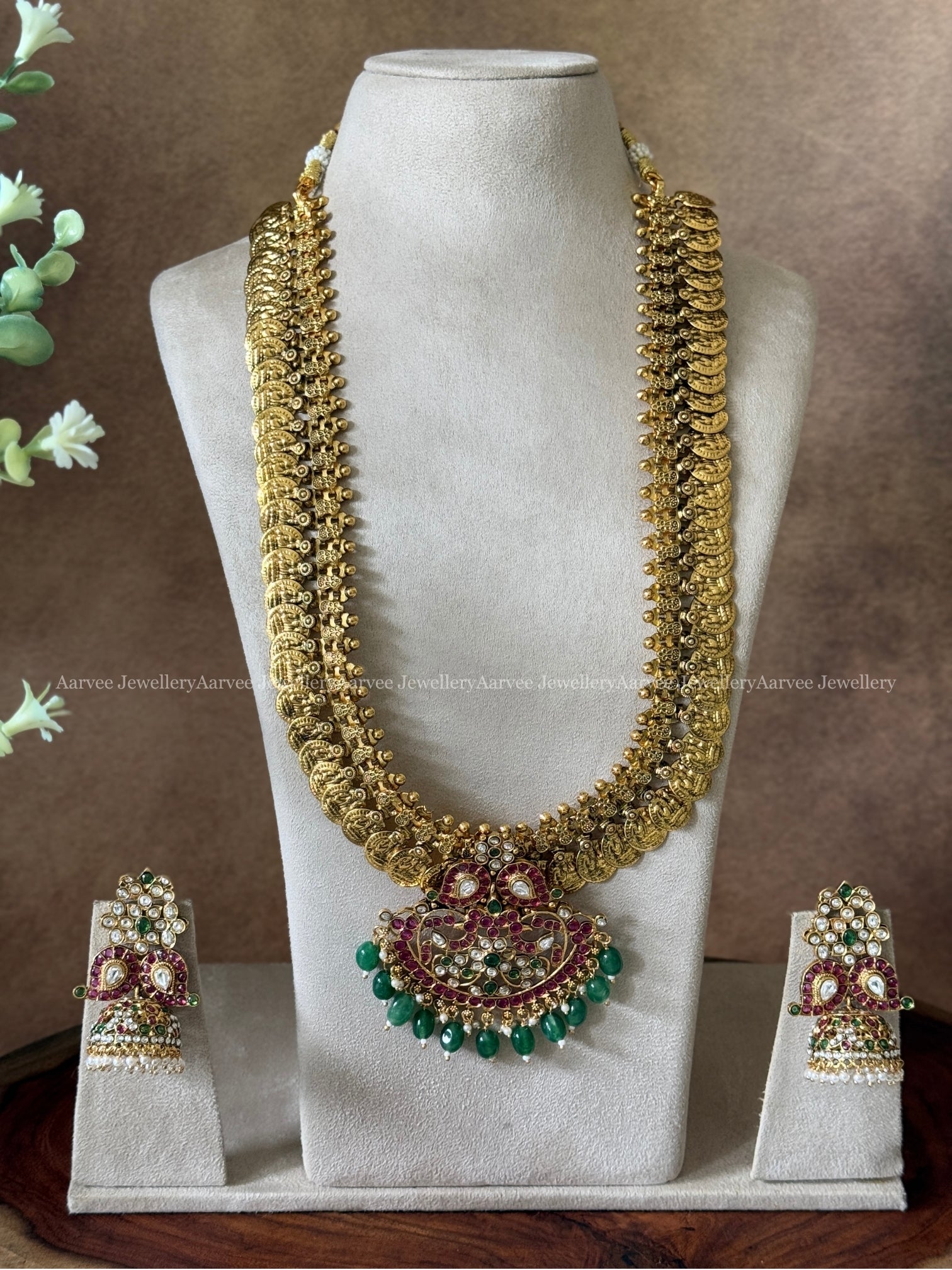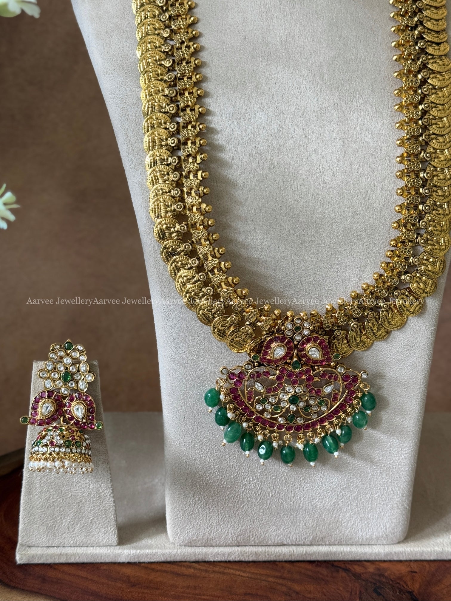 GOLD FINISH COIN MID LENGTH HARAM SET WITH MANGO KEMP STONES PENDANT IN GREEN BEADS