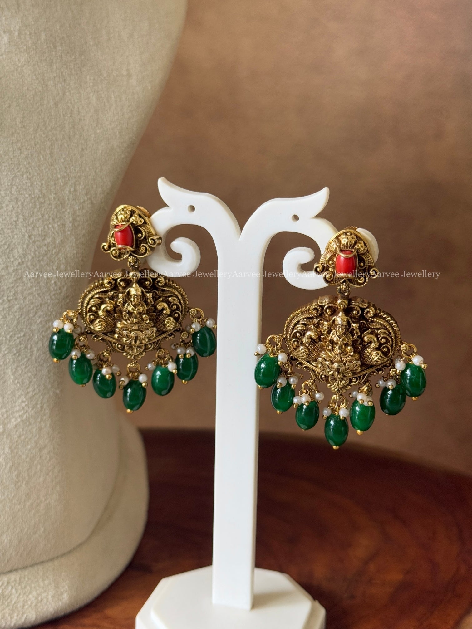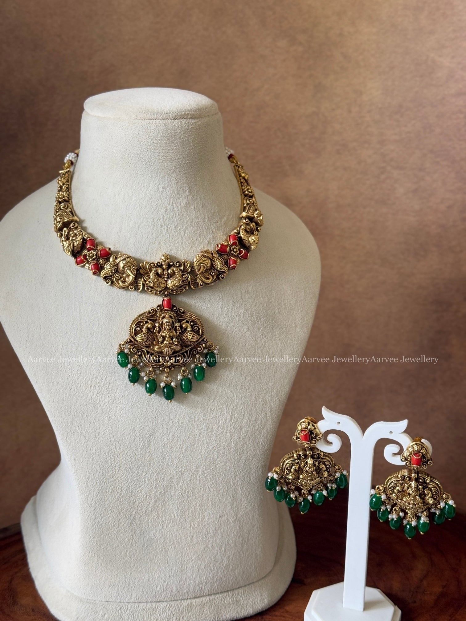 GOLD FINISH CORAL STONE KANTI NECKLACE SET WITH LAKSHMI PENDANT AND GREEN BEADS