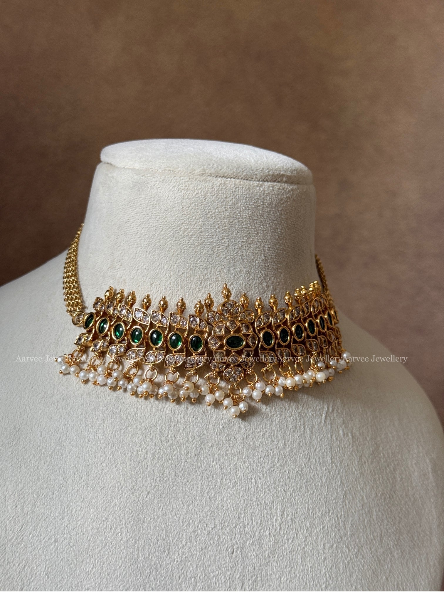 GOLD FINISH CZ STONES MINIMAL CHOKER SET WITH GREEN STONES