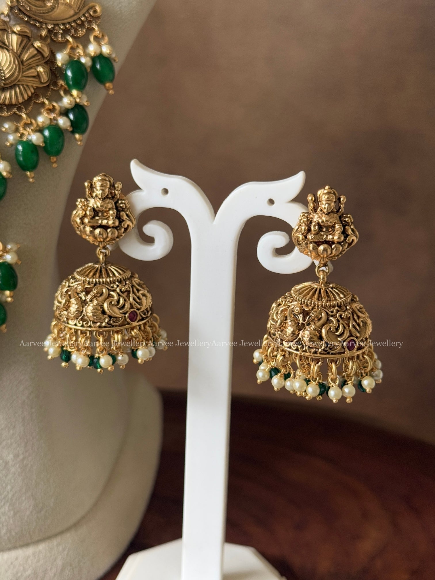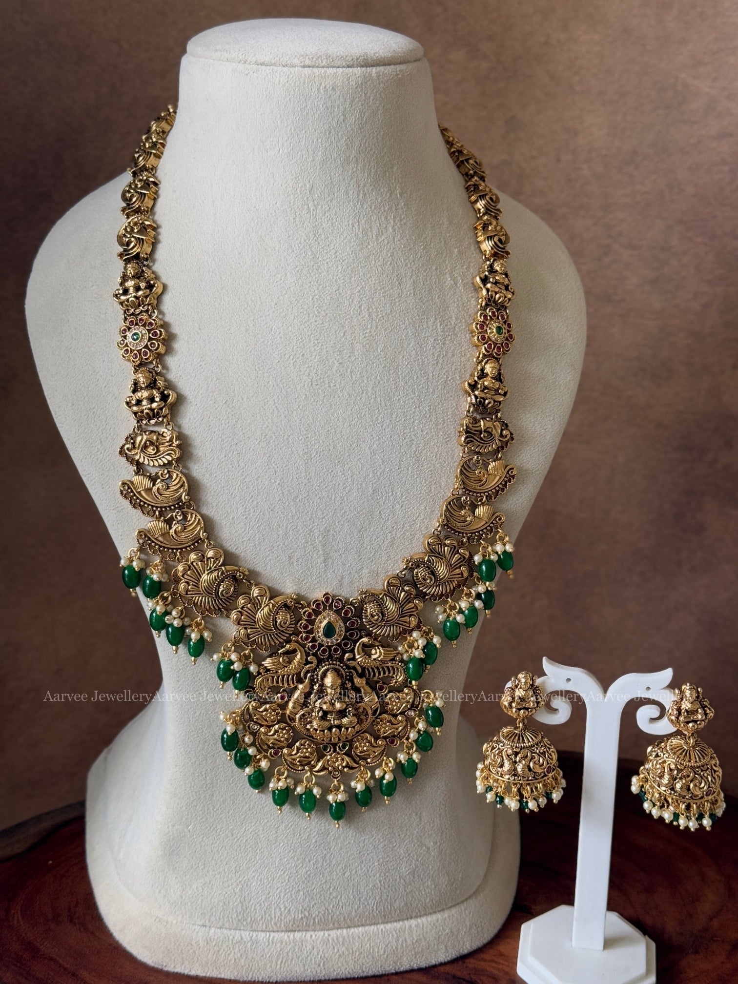 Antique Gold Finish Lakshmi & Peacock Pendant Haram with Green Beads