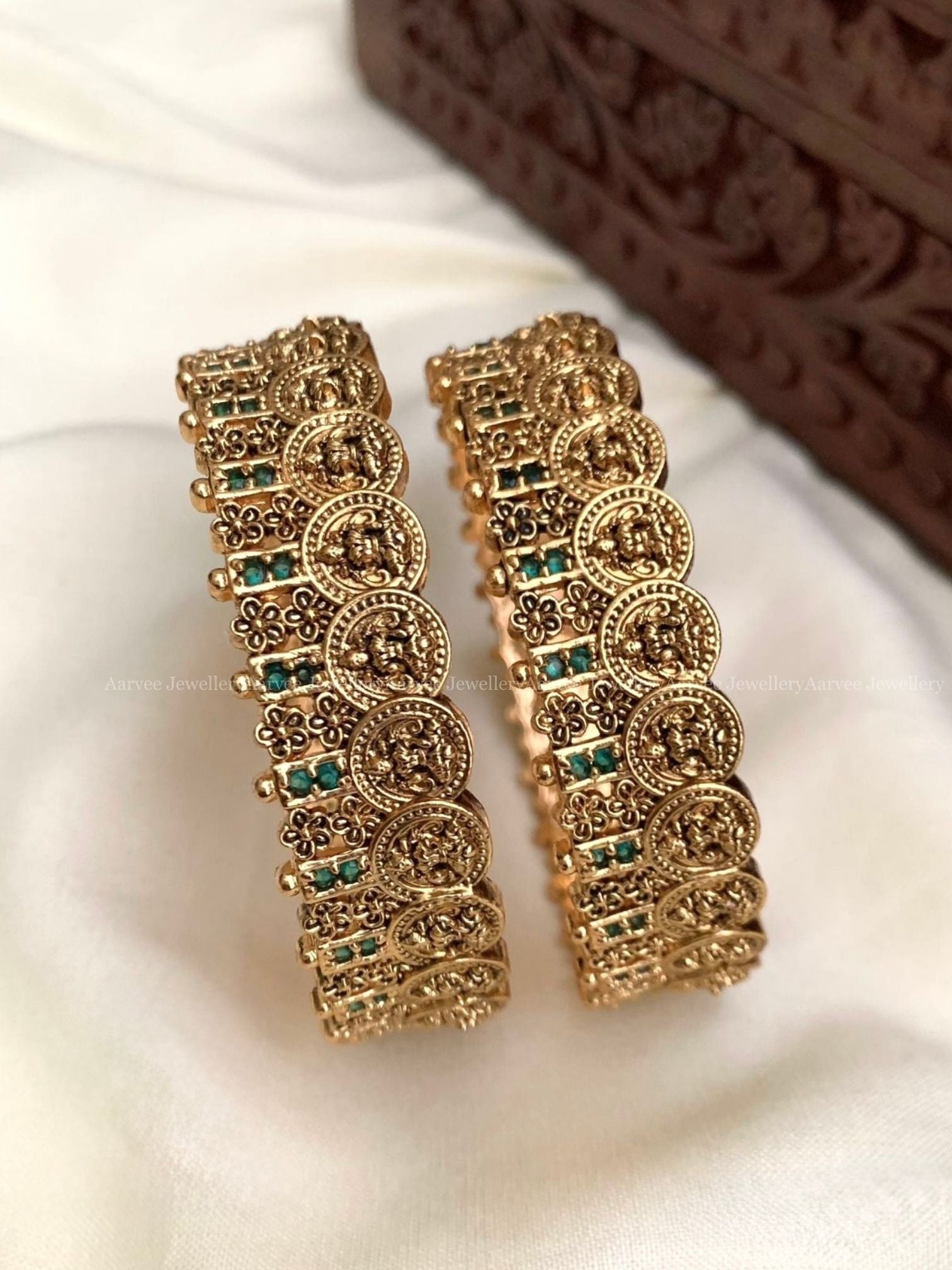 Antique-Style Gold Finish Bangles with Lakshmi Coin Motifs and Green Stone Highlights
