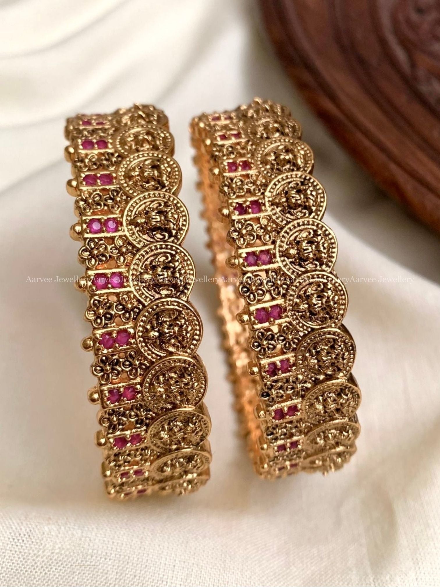 GOLD FINISH LAKSHMI COIN BANGLES WITH RUBY STONES