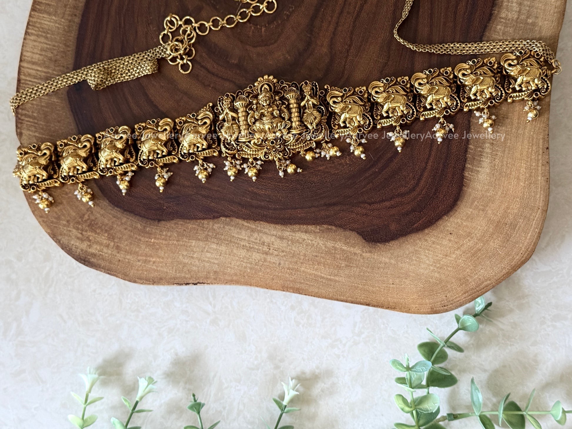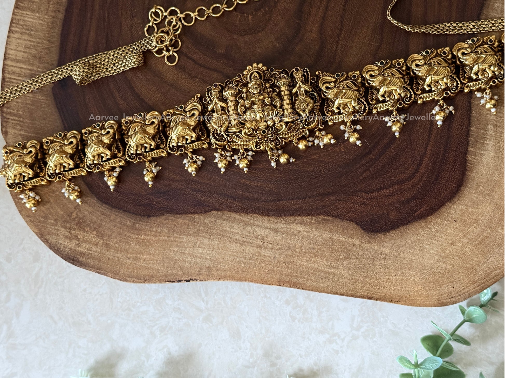 GOLD FINISH LAKSHMI & ELEPHANT MOTIF WAIST CHAIN WITH GOLD BEADS