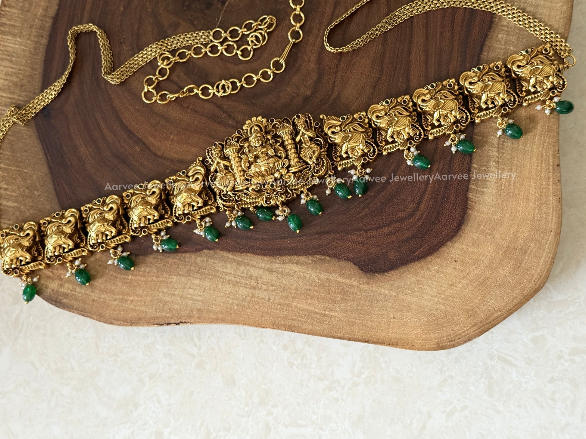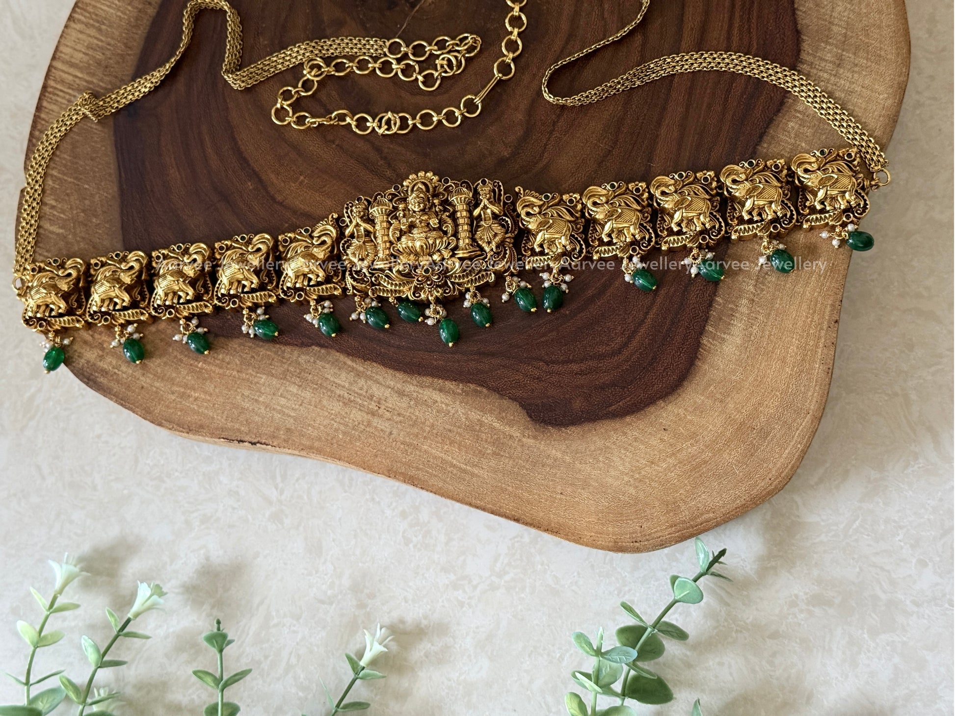 GOLD FINISH LAKSHMI & ELEPHANT MOTIF WAIST CHAIN WITH GREEN BEADS