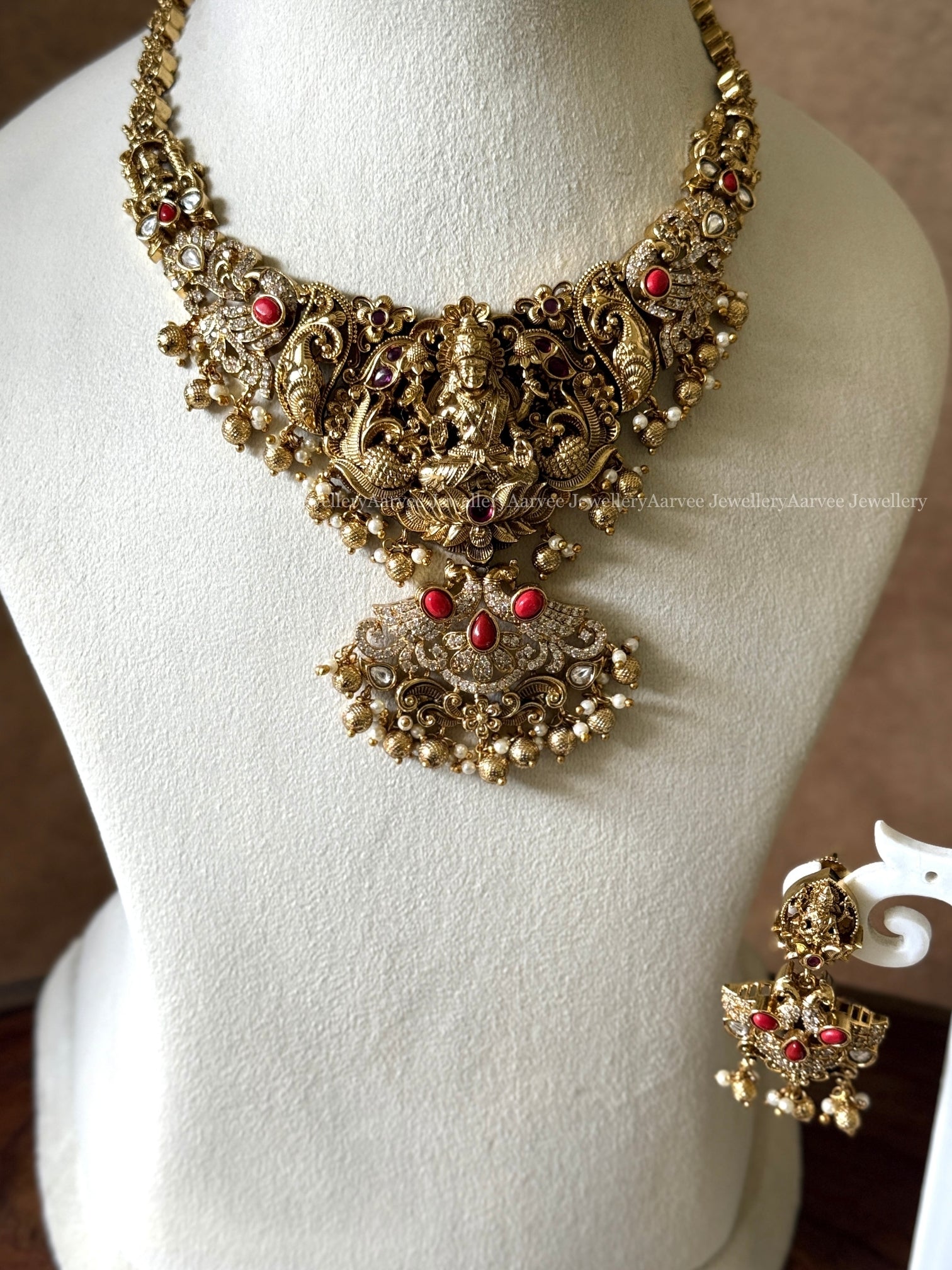 GOLD FINISH LAKSHMI NECKALCE SET WITH CORAL STONES