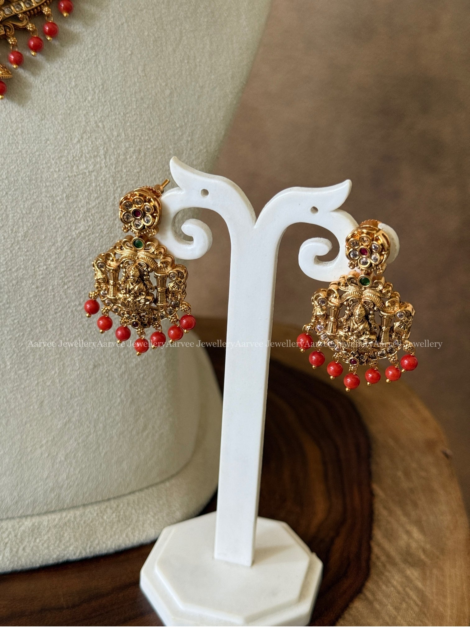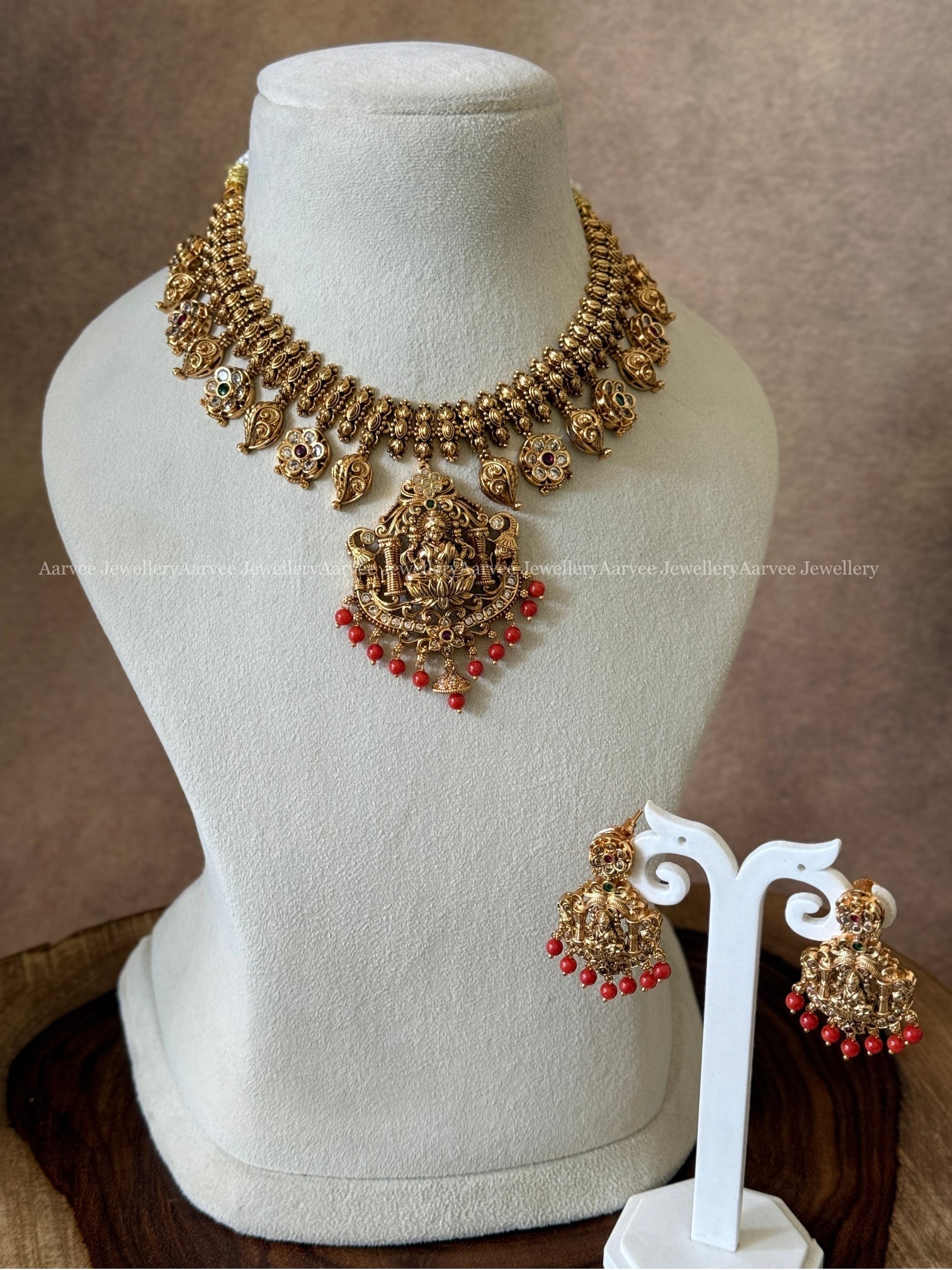 Traditional Lakshmi Necklace Set with Coral Beads and Gold Finish