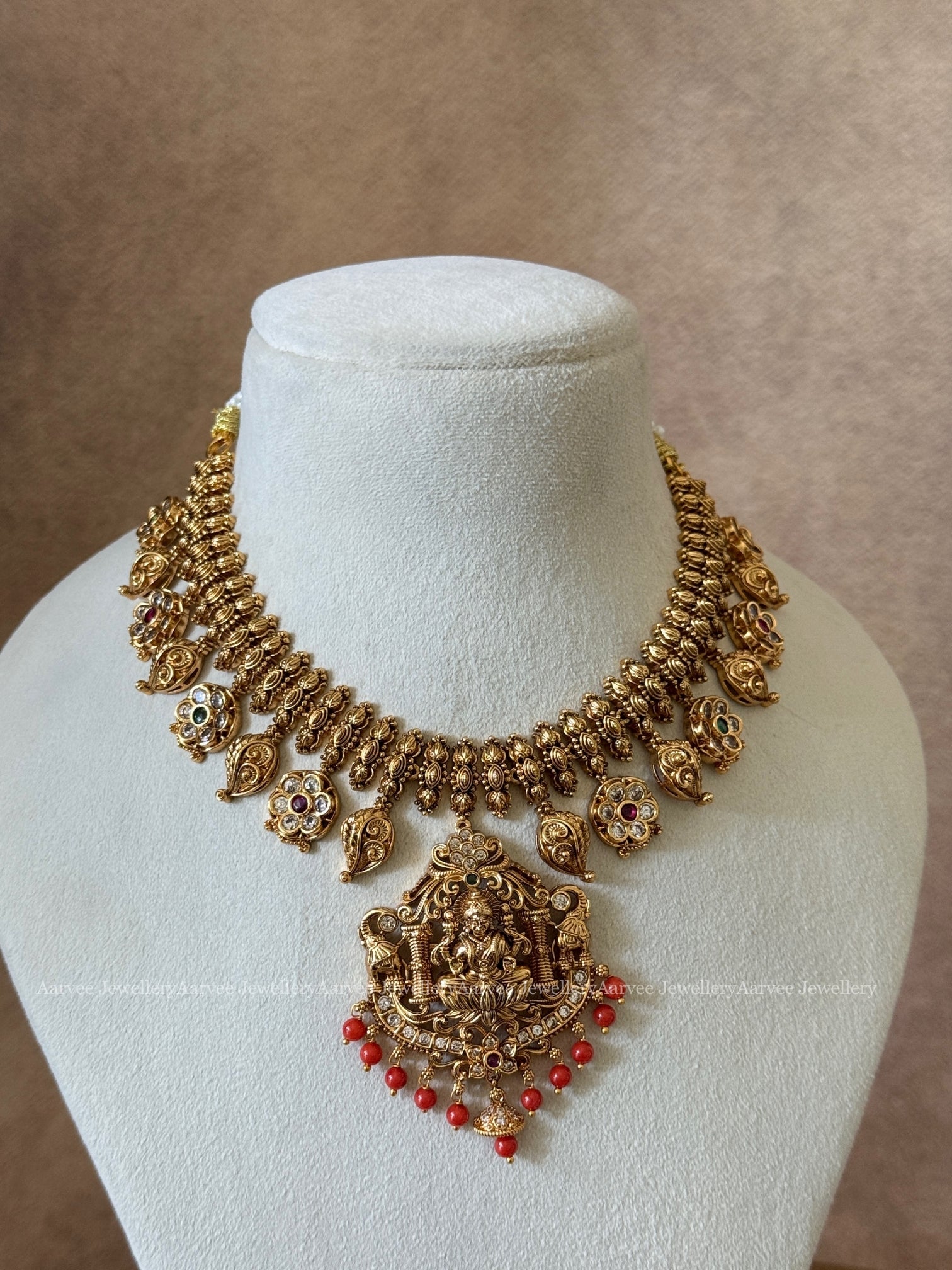 GOLD FINISH LAKSHMI NECKLACE SET WITH CORAL BEADS