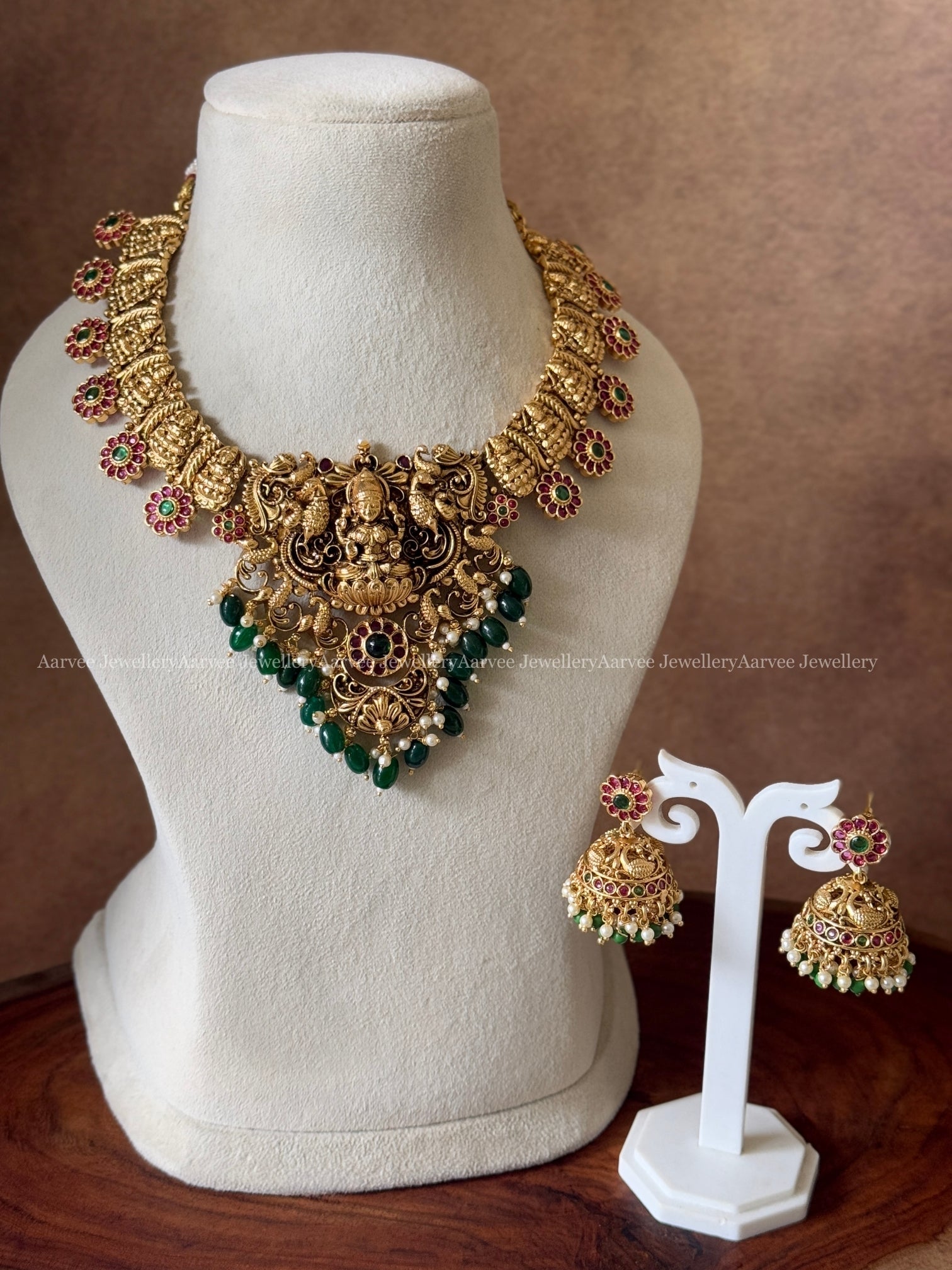 Traditional Lakshmi Necklace Set in Gold Finish Featuring Beautiful Green Beads