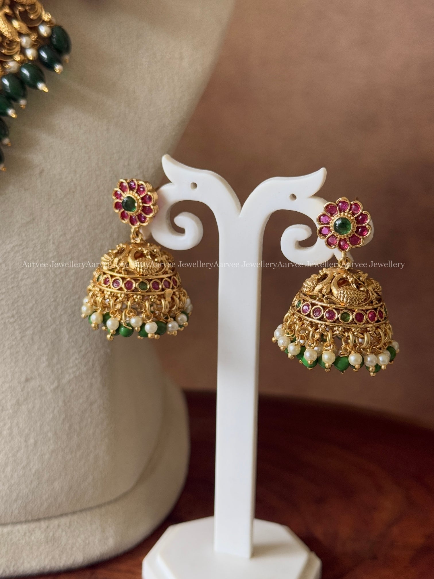 GOLD FINISH LAKSHMI NECKLACE SET WITH GREEN BEADS
