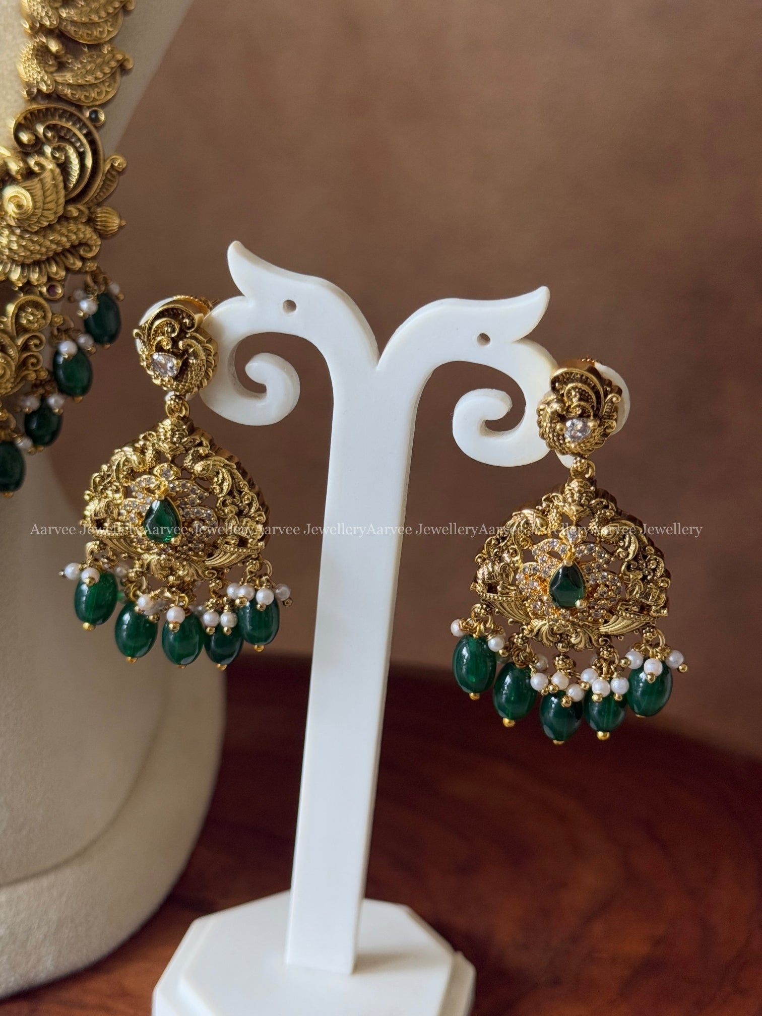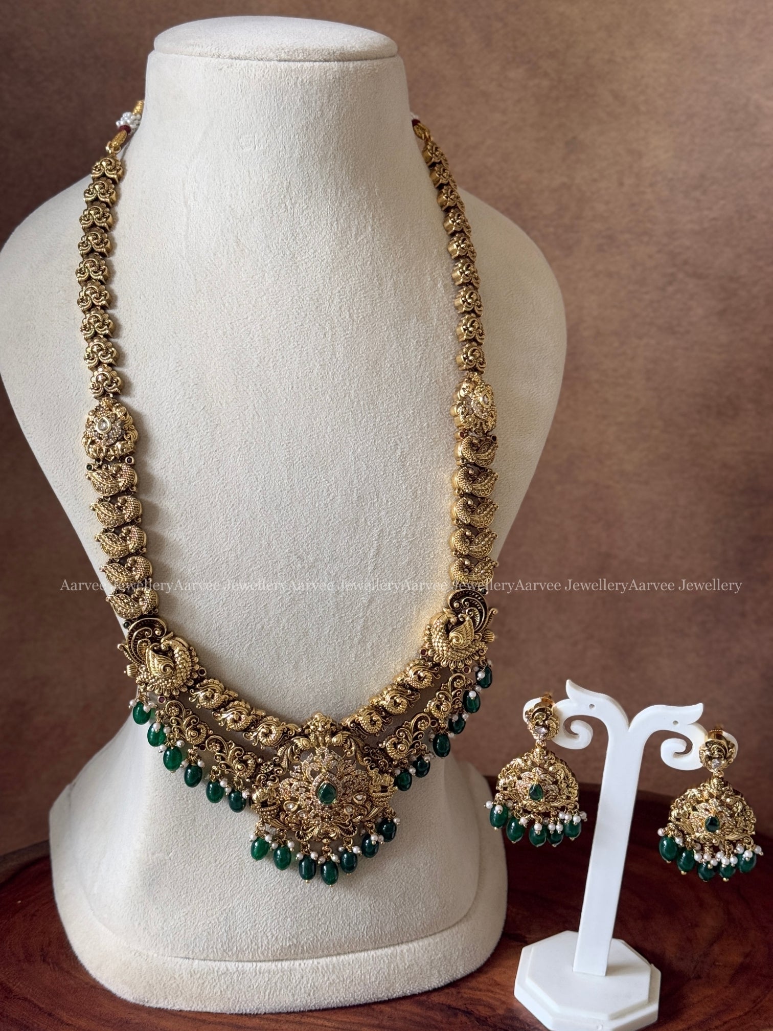 GOLD FINISH NON IDOL HARAM SET WITH GREEN BEADS