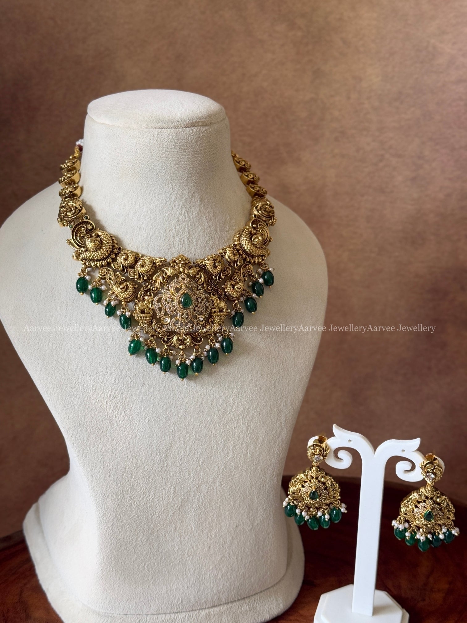 Graceful Non-Idol Necklace Set in Gold Finish with Beautiful Green Bead Detailing