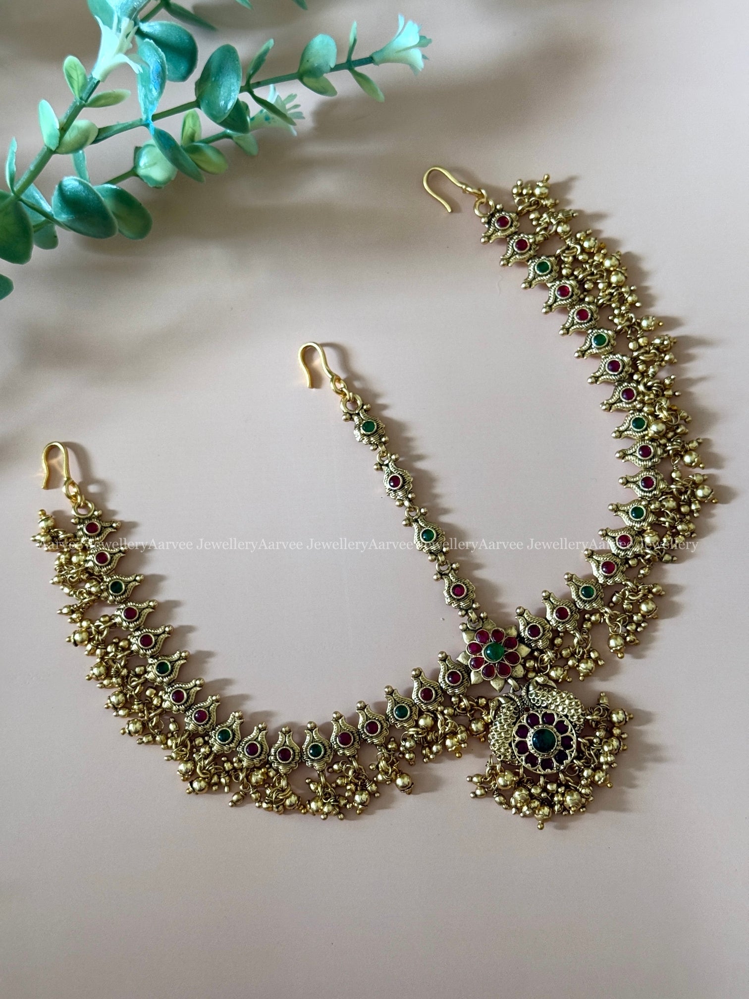 Peacock Design Mathapatti in Gold Polish with Rich Kemp Stones and Delicate Gold Beads