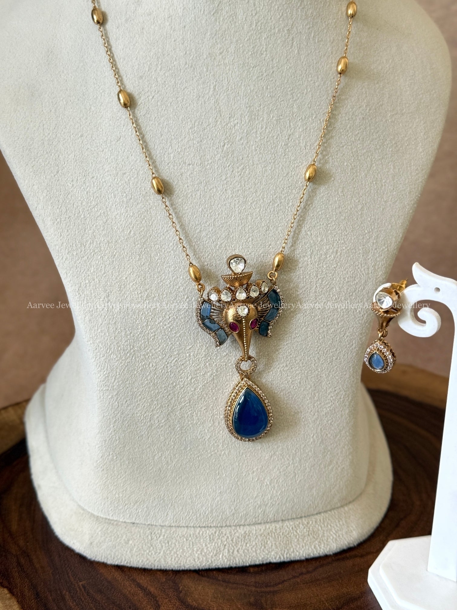 GOLD MID LENGTH CHAIN SET WITH ELEPHANT PENDANT IN BLUE STONES