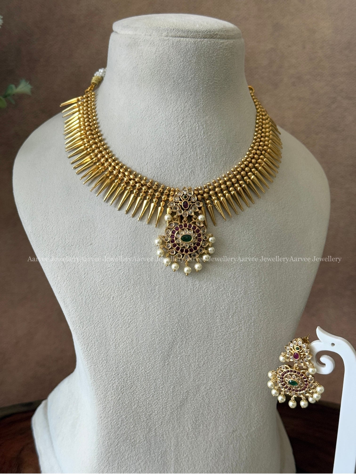 Embrace timeless elegance with this handcrafted Gold-Tone Mullamottu Necklace Set, featuring a dazzling CZ Floral Pendant. Finished with radiant gold plating and paired with matching earrings, this set offers a regal and complete look. Ideal for festive occasions, it beautifully blends traditional craftsmanship with contemporary sophistication — a must-have for lovers of heritage-inspired jewellery