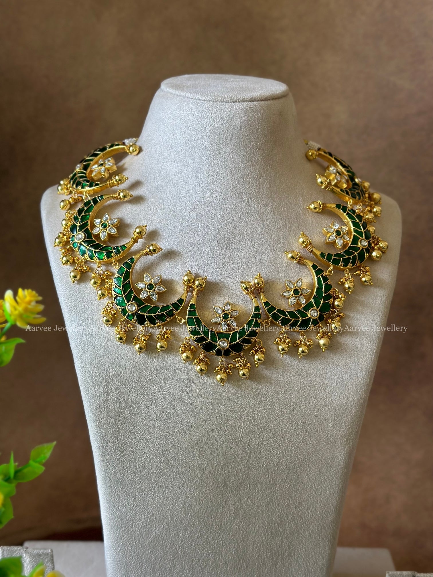 Make a statement with this stunning Jadau Kundan Necklace, highlighted by a striking Green Stone 7-Chand Pendant